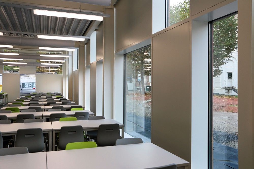 De refter is opgevat als een open en uitnodigend paviljoen in de groene binnentuin van de campus Plein. De ondersteunende functies (keuken, bergingen, sanitair, technische ruimtes) werden ter hoogte van de te slopen werkplaatsen tegen de tuinmuur op de perceelgrens geplaatst en vormen een langwerpig, gesloten volume.