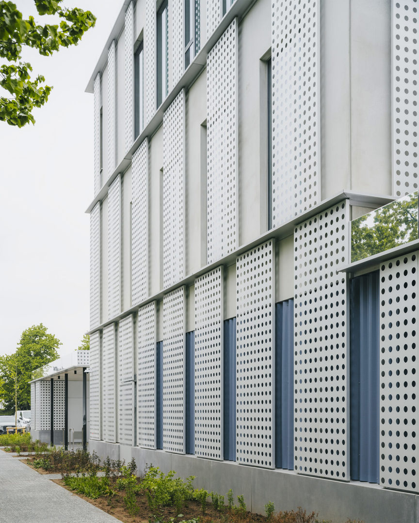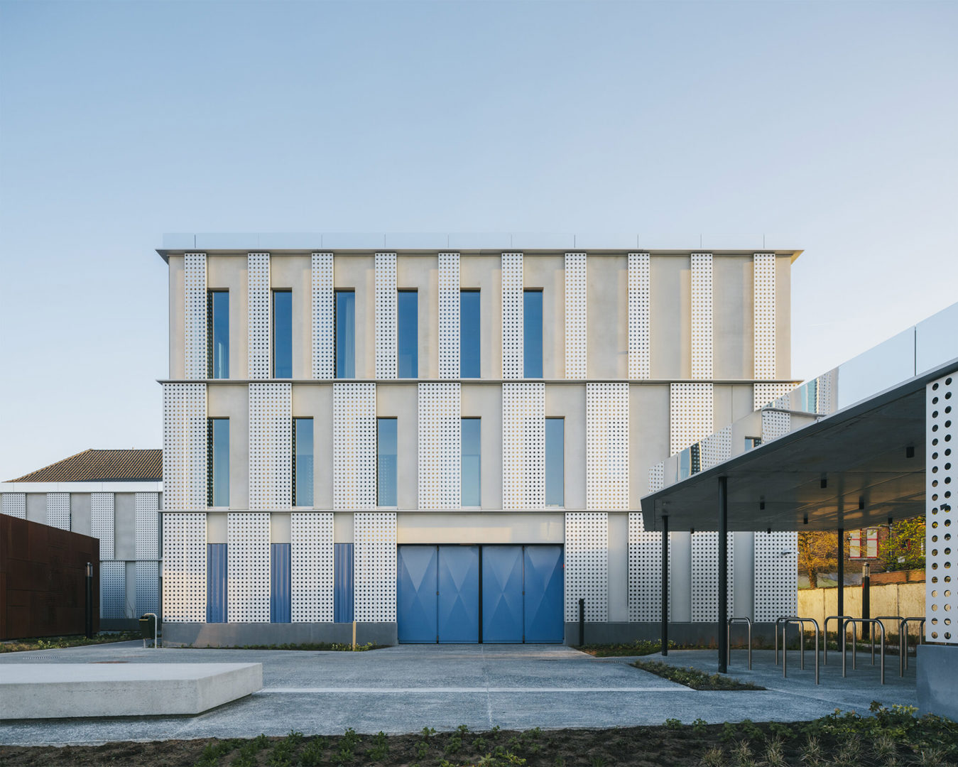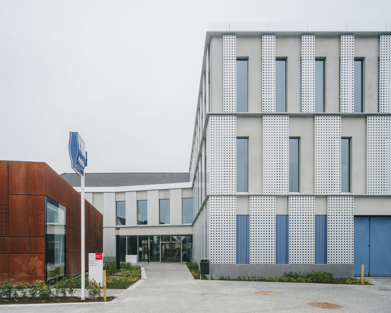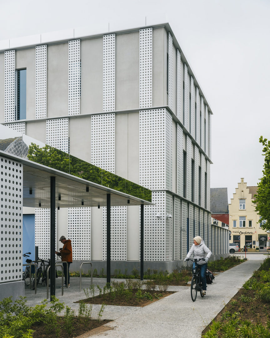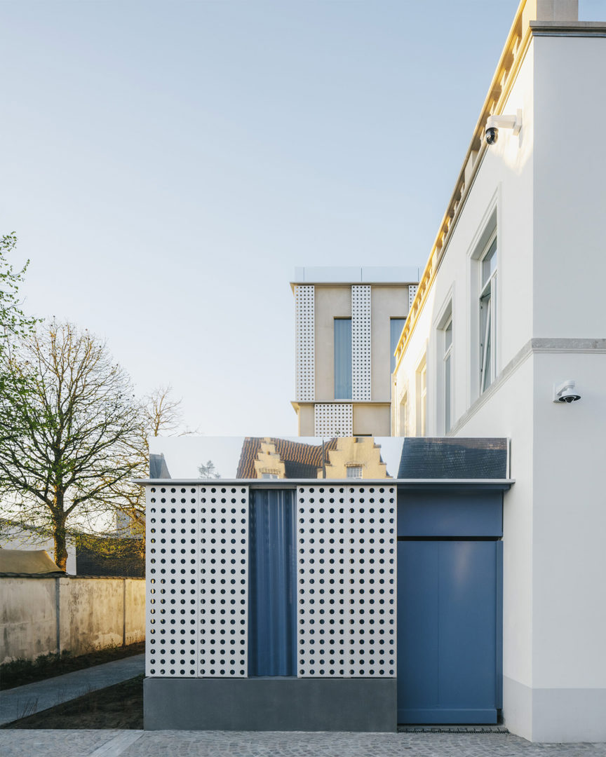 De hedendaagse uitbreiding van AC Sint-Andries is geen vrijblijvende toevoeging, maar een gelaagde interpretatie van het bestaande. De gevelopbouw vertaalt klassieke elementen zoals wit pleisterwerk, arduin en geprofileerde lijsten naar een abstracte vormentaal. Grote perforaties in het aluminium gevelvlak zorgen voor luchtigheid en nuance, terwijl het ritme van de raamopeningen de schaal van het project bewaakt. Blauwe en rode accenten verwijzen subtiel naar respectievelijk de politie en de stadsdiensten — een knipoog naar de Brugse stadskleuren. De ingrepen aan de buitenruimte sluiten daarbij aan: groenaanleg, waterdoorlatende verharding en nieuwe zitbanken creëren een open en toegankelijke publieke plek.