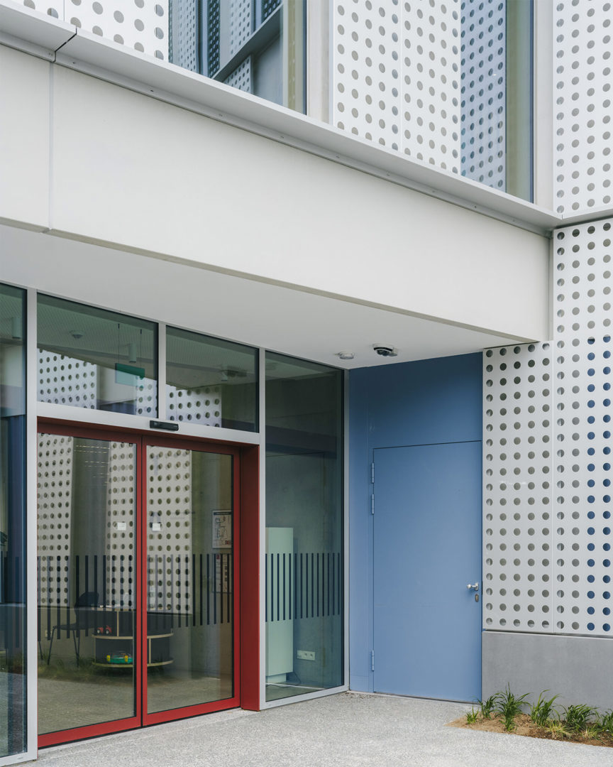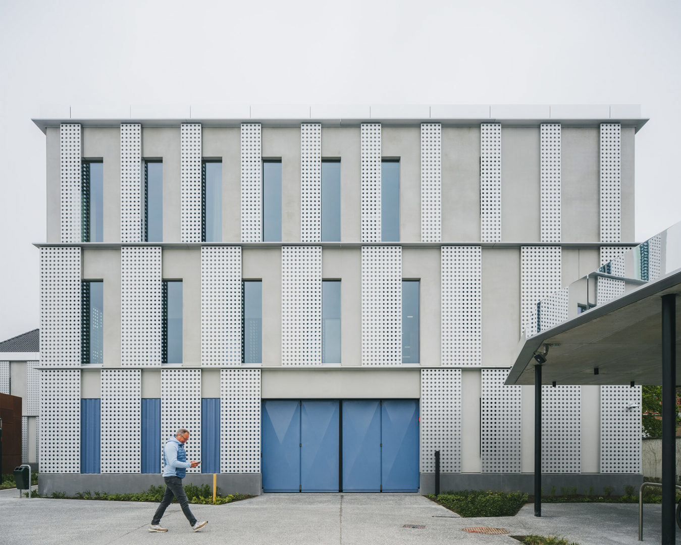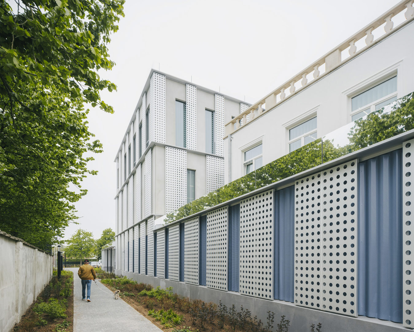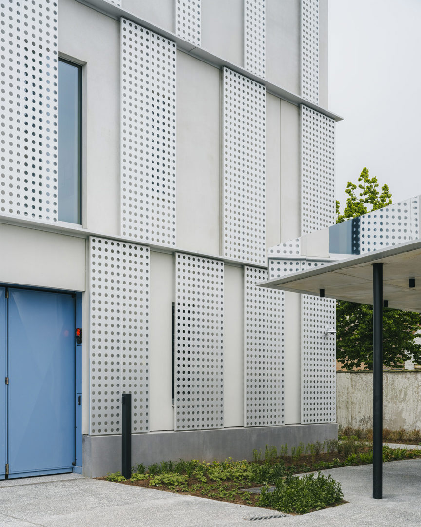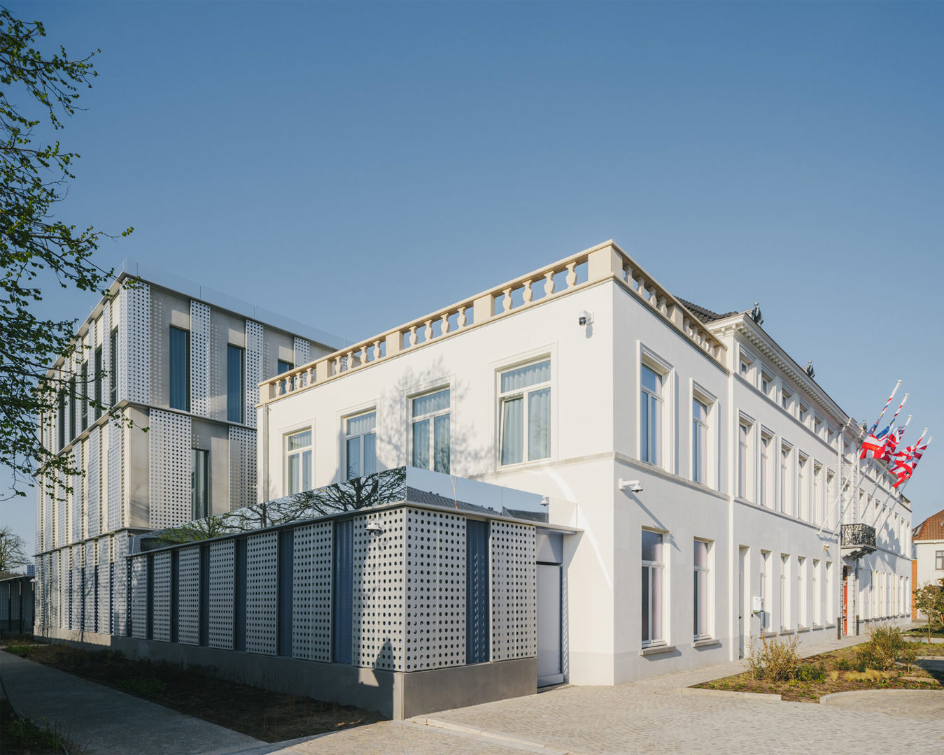 De hedendaagse uitbreiding van AC Sint-Andries is geen vrijblijvende toevoeging, maar een gelaagde interpretatie van het bestaande. De gevelopbouw vertaalt klassieke elementen zoals wit pleisterwerk, arduin en geprofileerde lijsten naar een abstracte vormentaal. Grote perforaties in het aluminium gevelvlak zorgen voor luchtigheid en nuance, terwijl het ritme van de raamopeningen de schaal van het project bewaakt. Blauwe en rode accenten verwijzen subtiel naar respectievelijk de politie en de stadsdiensten — een knipoog naar de Brugse stadskleuren. De ingrepen aan de buitenruimte sluiten daarbij aan: groenaanleg, waterdoorlatende verharding en nieuwe zitbanken creëren een open en toegankelijke publieke plek.