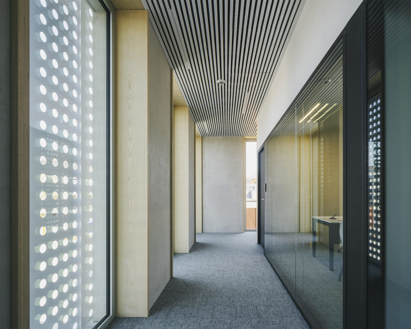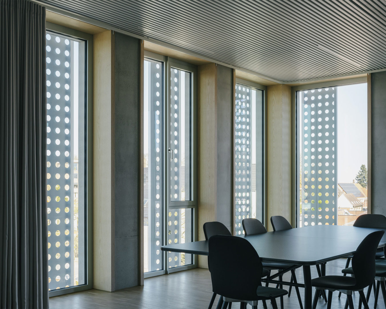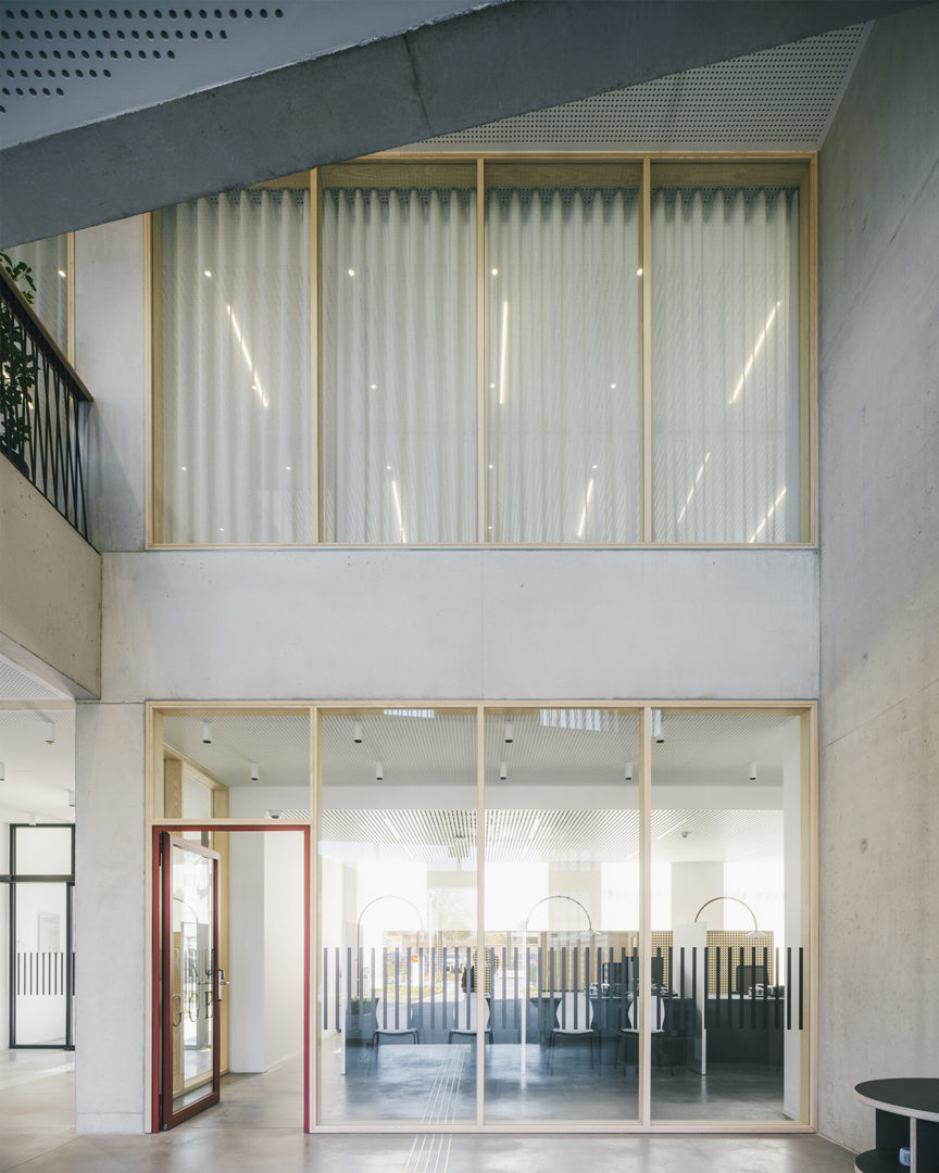 Het interieur sluit aan bij die ingetogen elegantie. Materialen zijn duurzaam en tactiel, kleuren zijn zacht en neutraal. De gekozen raamdecoratie en binneninrichting versterken de rust en het daglichtgevoel. Overal wordt functionaliteit gekoppeld aan comfort: werkruimtes, wachtruimtes, onthaalbalies en circulatiezones zijn doordacht ontworpen. Die aandacht voor de dagelijkse werking is misschien minder spectaculair, maar des te belangrijker. De architectuur ondersteunt de gebruikers in plaats van zich op te dringen. Zo ontstaat een gebouw dat past bij zijn rol: dienstbaar, stevig verankerd in de wijk, en met een uitgesproken publieke missie.