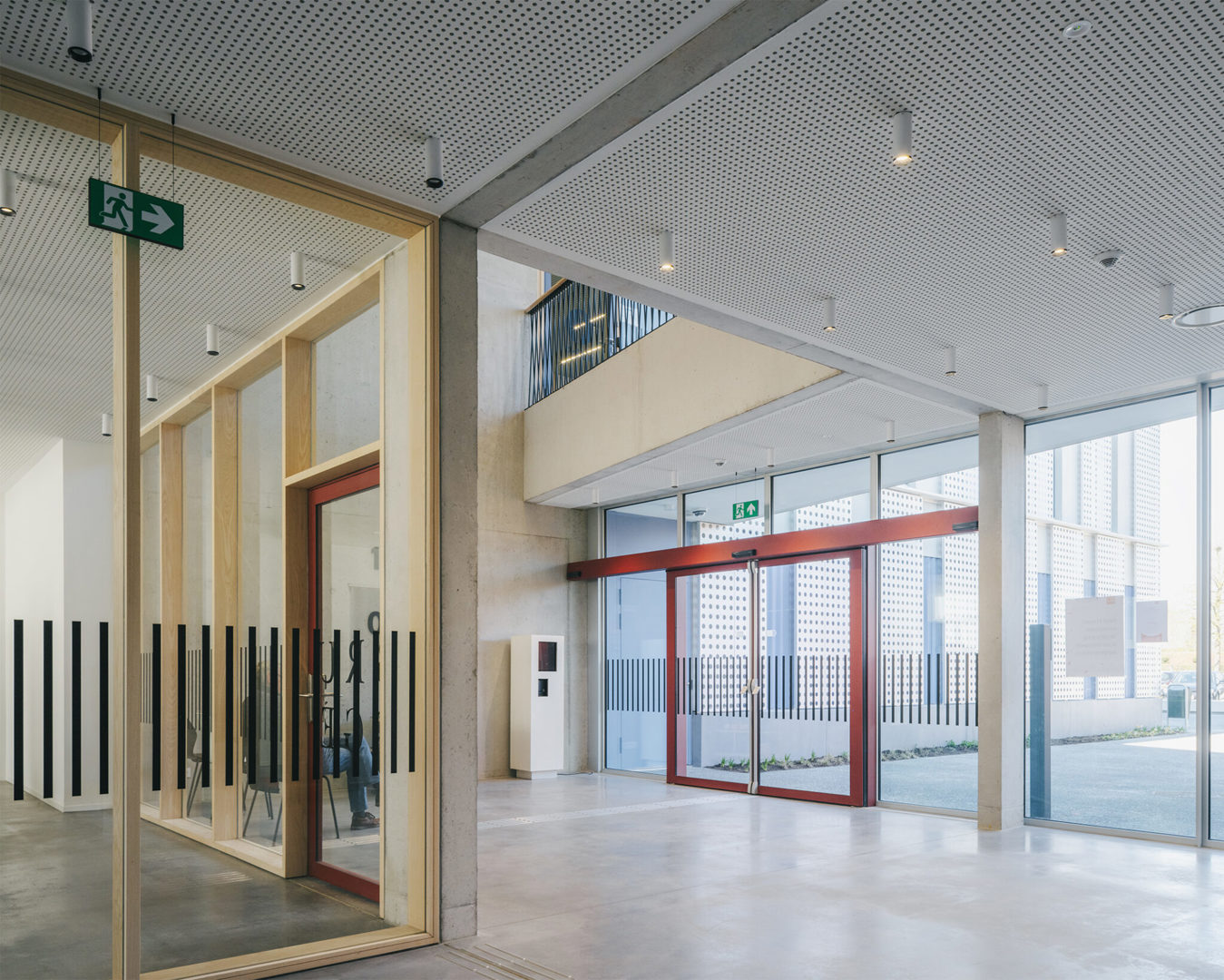 Ook binnenin heerst rust en helderheid. De gelijkvloerse verdieping is voorbehouden aan het deelgemeentehuis, waar inwoners terechtkunnen voor allerlei administratieve formaliteiten. Bovenin huizen de diensten van de Regio West van Politie Brugge, met werkplekken voor zo’n vijftig medewerkers. In het ontwerp is veel aandacht besteed aan comfort en functionaliteit: aparte onthaalzones, ruime kleedkamers, een eetruimte met terras, douches en een performante klimaatregeling. Vooral de nood aan beveiliging vroeg om precieze afstemming met de opdrachtgever. Toch wist laagland architecten een open, laagdrempelig gebouw te realiseren dat tegelijk bescherming en transparantie uitstraalt.