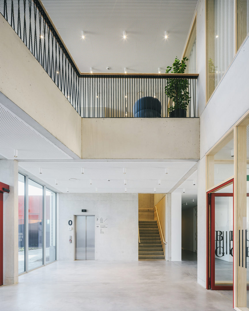 Een bijzonder element is de doorsteek naar de bibliotheek, die de publiekswerking van het centrum uitbreidt. De bibliotheek beschikt over een ruime collectie, organiseert activiteiten en biedt ook digitale hulp aan. Zo groeit AC Sint-Andries uit tot meer dan een administratief gebouw: het is een plek voor ontmoeting, dienstverlening en culturele uitwisseling. De clustering van diensten op één site is niet alleen efficiënt, maar versterkt ook de binding met de buurt. Inwoners vinden er letterlijk en figuurlijk hun weg. De architectuur ondersteunt deze functie met duidelijke circulatie, korte looplijnen en een heldere opdeling van publiek en personeel.