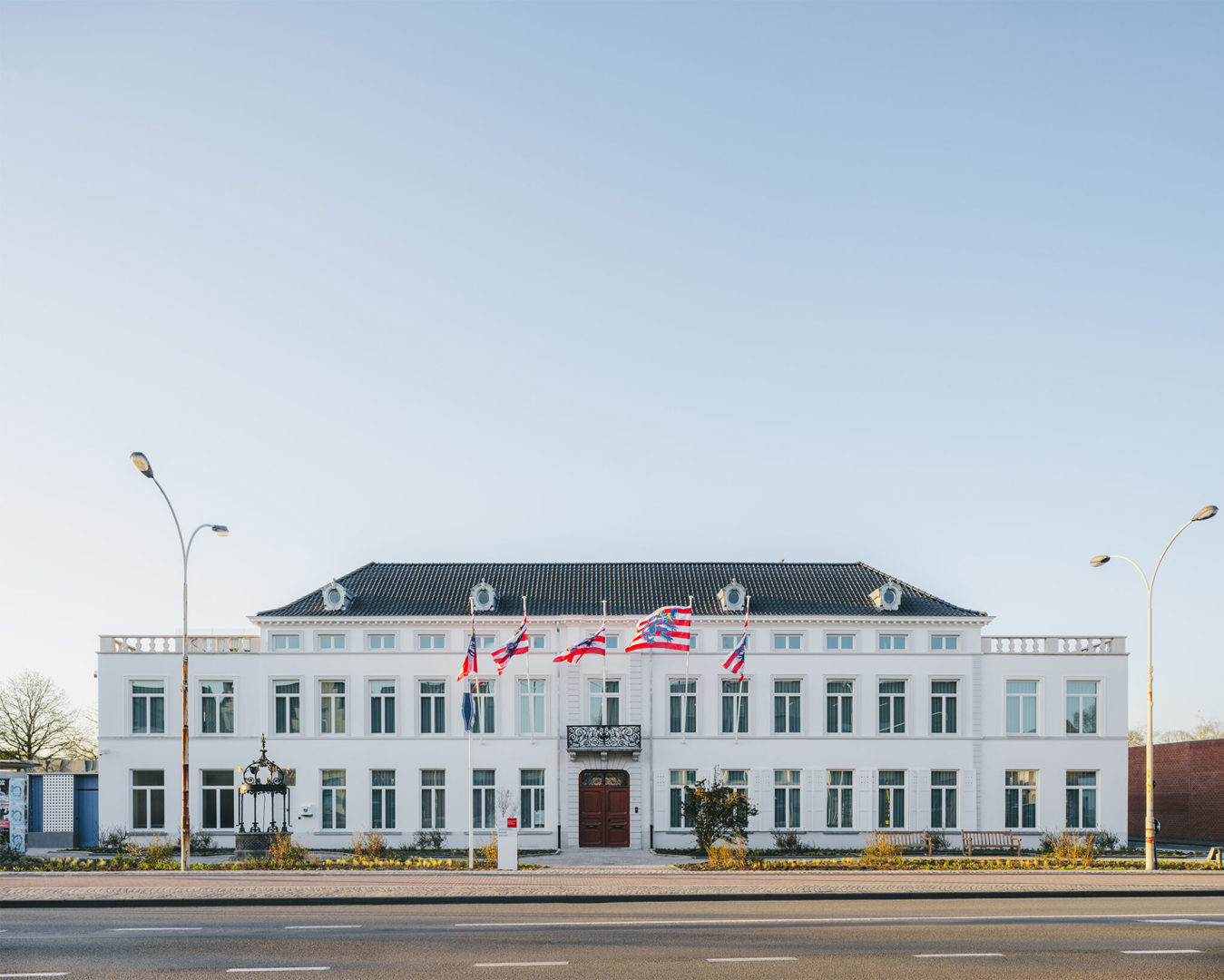De ontwerpers stelden zich voor een complexe opgave. Enerzijds was er het historisch karakter van het bestaande pand, erkend als bouwkundig erfgoed. Anderzijds waren er de hedendaagse technische, programmatische en veiligheidsvereisten van een administratief centrum én politiekantoor. Laagland architecten koos voor een duidelijke tweedeling: de voorkant van het perceel behoudt het statige beeld van het herenhuis, de achterkant maakt plaats voor een moderne uitbreiding. De architectuur slaagt erin beide helften te verbinden in een harmonieus geheel, onder meer via een ritmische gevelcompositie in witte betonelementen en aluminium schrijnwerk, op een sobere antracietkleurige sokkel.