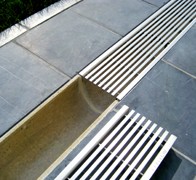 Voor grote terrassen voorziet ACO Euroline afvoergoten met een inox lengtestaafrooster. De voordelen zijn dezelfde als bij de Gallo-afvoerputten. De makkelijk bij te slijpen gootjes worden goed vastgelegd in de stabilisé, op een hoogte die een paar millimeter lager is dan de omliggende tegels zodat het water er snel en zonder plasvorming in kan lopen. De uitsparing tussen de gootnaden is stofvrij gemaakt en nadien opgespoten met een voegmassa die ongeveer dezelfde kleur heeft als het polyesterbeton van de goten. Dit resulteert in een volledig vloeistofdichte gootlijn die uitmondt in een vertikaal aangesloten rioleringsbuis.