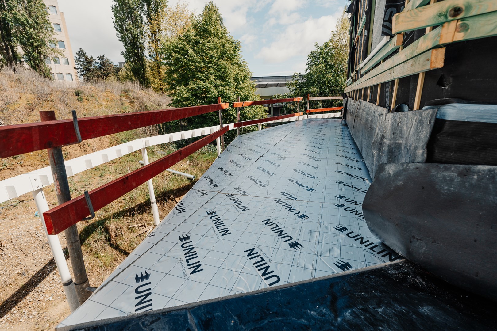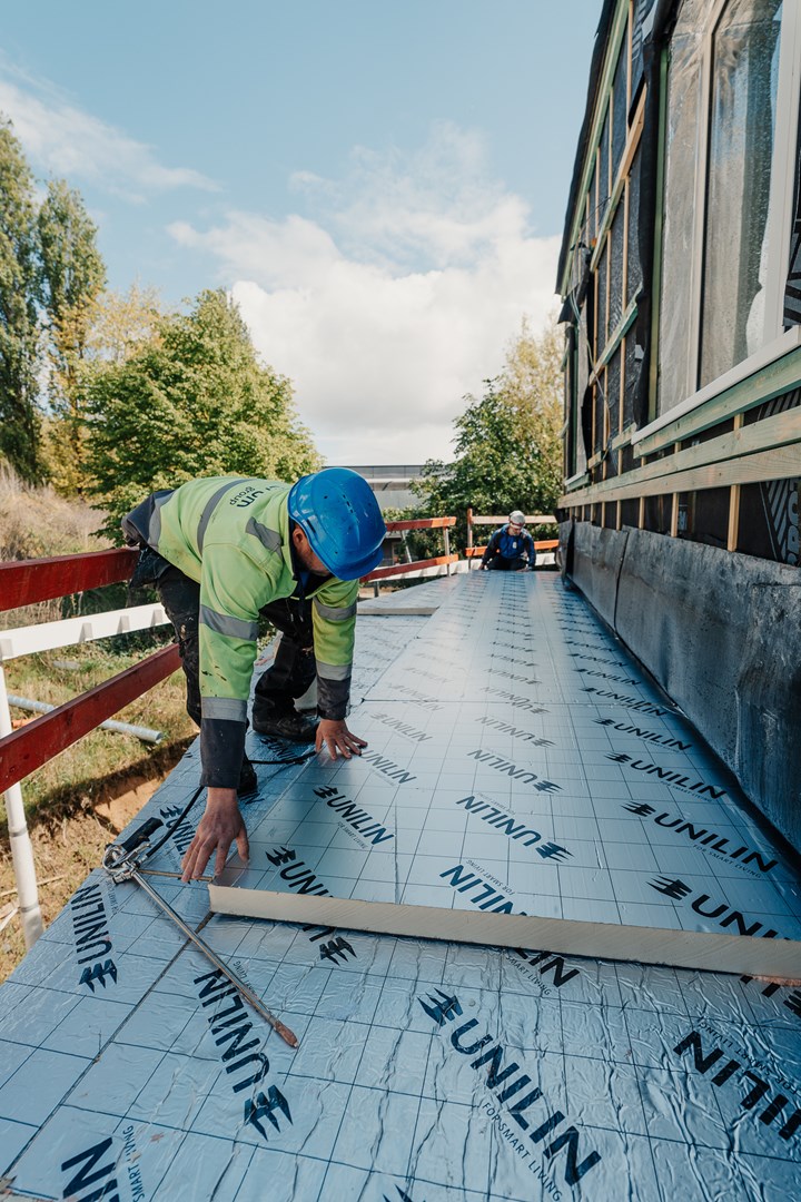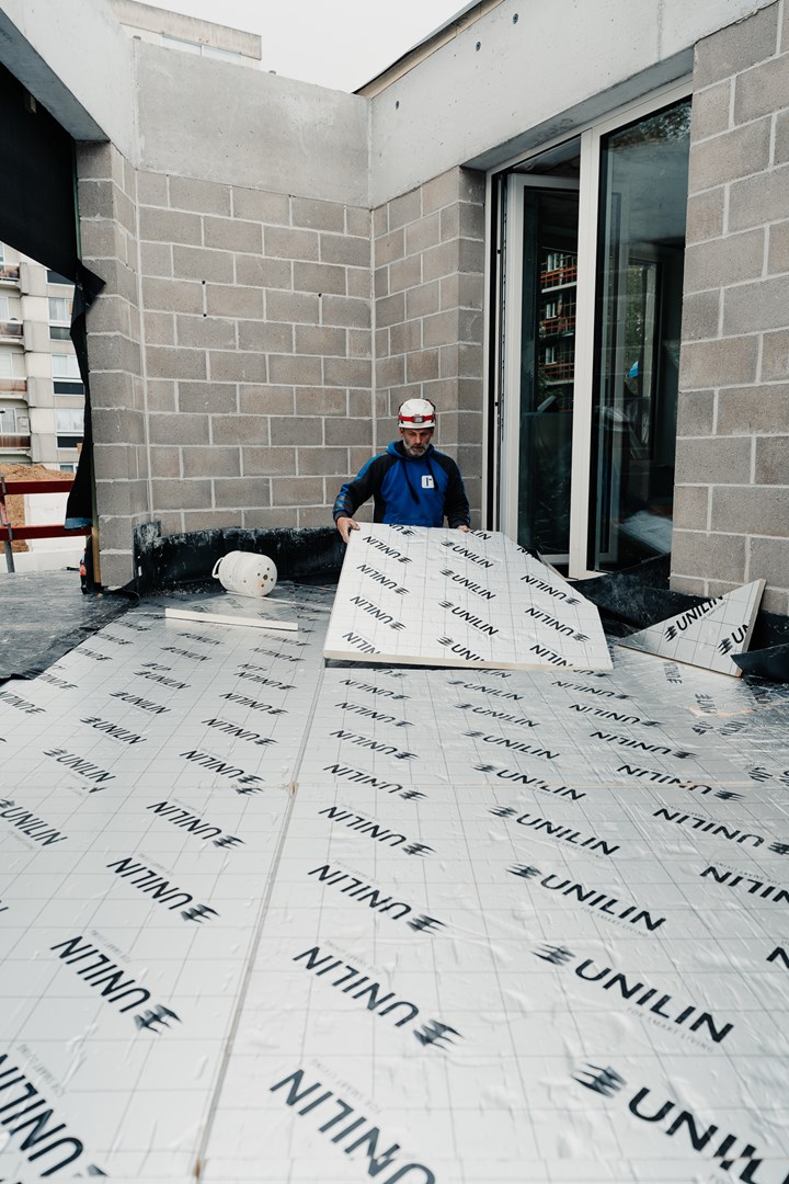 In Sint-Jans-Molenbeek krijgt een nieuwe woonsite vorm. Aan de ene kant staan de Mettewie assistentiewoningen, aan de andere zijde vind je de sociale woningen van Condor. En middenin? Daar staat de conciërgewoning met een unieke, twaalfhoekige vorm. Voor de afschotisolatie van het terras leverde Unilin Insulation het cruciale materiaal en een nauwkeurig legplan om efficiënte waterafvoer en optimale isolatie te garanderen.