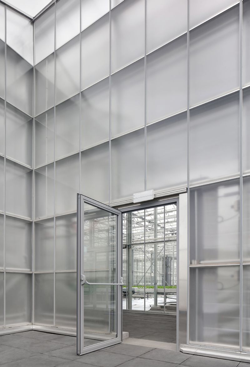 Het hele gebouw bestaat uit één standaardserre met diffuus glas. De serre op de twee uitkragende gebouwkoppen oogt bijzonder door de expressieve, gefacetteerde gevels in transparant glas. Aan de ingangzijde vormt de facetgevel verticale glazen erkers die de mogelijkheid bieden gerichte zonwering toe te passen met behoud van zichten naar binnen en buiten. Aan de westzijde van de gevelserre langs de ring garandeert de horizontale opbouw in facetten een goede inval van de zonnestralen voor het gewas en een reflectieloze inkijk vanaf het maaiveld.