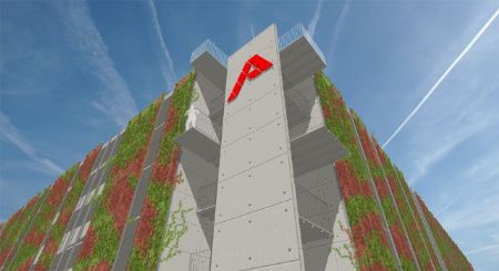 Het duurzame ruimtegebruik is niet het enige duurzame karakter van het project: er wordt verder gewerkt met LED-verlichting en een systeem dat regenwater gebruikt om de groene gevel te bevochtigen. De groene gevel zelf dient als geluidsdemper van de parking.