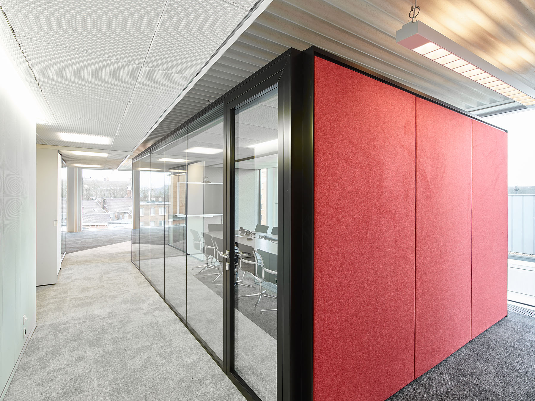 Het nieuwe werken, waar het ruimtegevoel een belangrijke rol speelt, wordt uiteraard niet door elke werkgever geïmplementeerd. Waar er vroeger gecombineerd moest worden met een volle systeemwand om het gewenste akoestisch comfort te bekomen, kan dit nu volledig ingevuld worden met het nieuwe moderne JB PURE 100 wandsysteem dat staat voor transparantie en akoestisch comfort. Met zijn minimalistisch design past het binnen elk project.