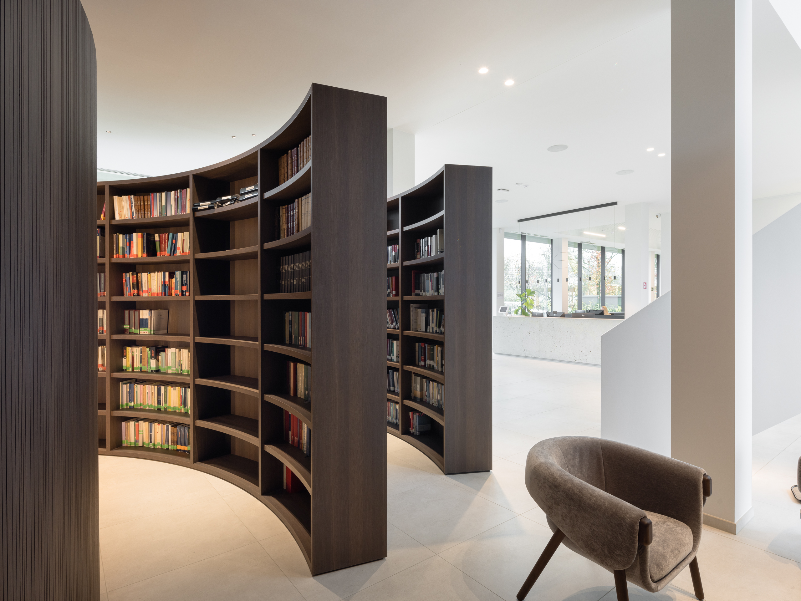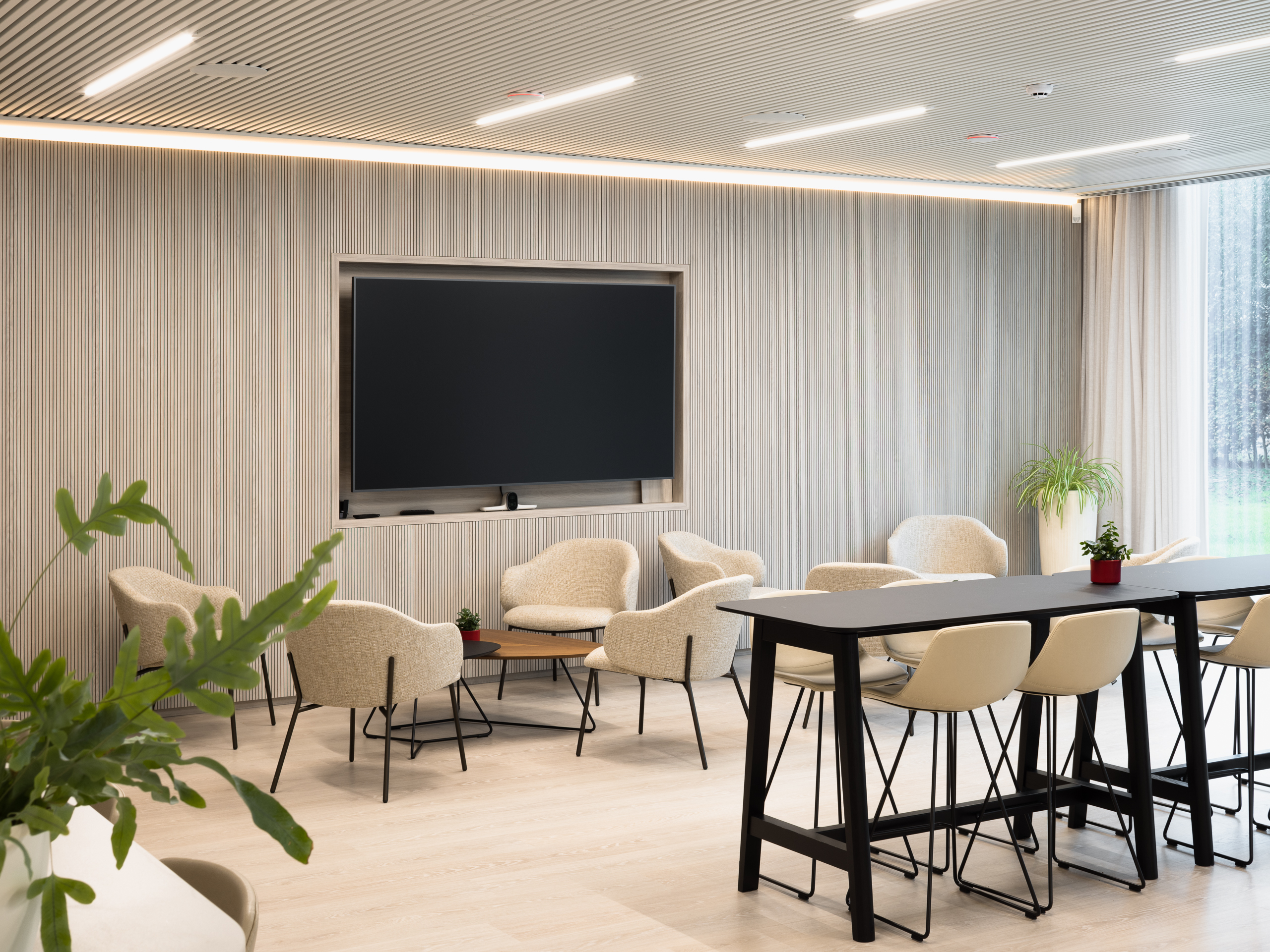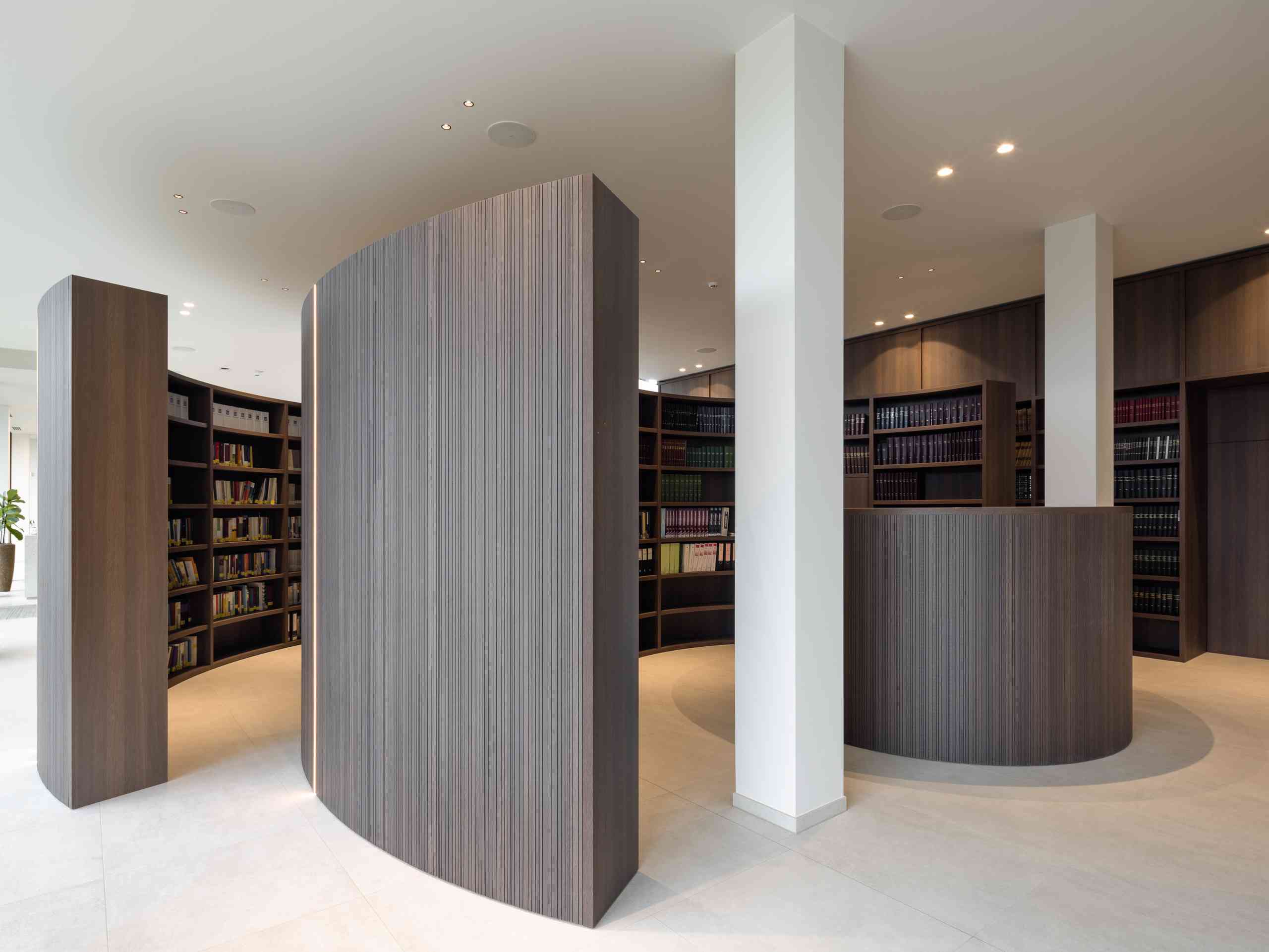 Triplaco leverde akoestische producten voor zowel rechte als gebogen wanden en meubels, die werden uitgevoerd met een HPL toplaag op een zwarte kern. De kleuren voor de wanden en meubels, donkere eik (1392ROT) en bleke Olmtint (1394ROT), werden zorgvuldig gekozen om een luxe, maar professionele uitstraling te creëren. Deze kleuren passen perfect bij de strakke en organische vormen die de interieurarchitecten in hun ontwerp voor ogen hadden.