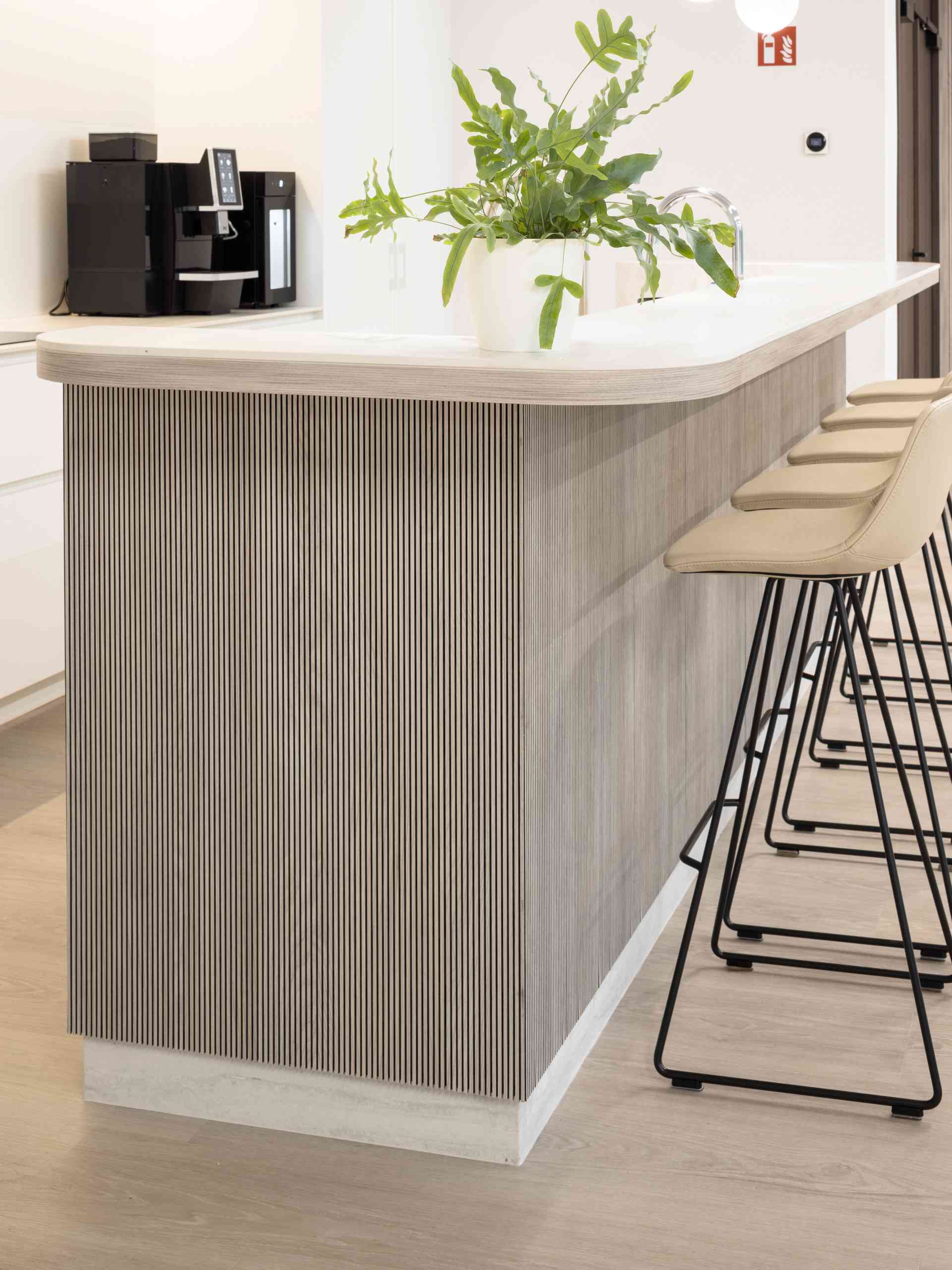 Triplaco’s specialiteit in gebogen wanden en akoestische panelen komt duidelijk naar voren in dit project. De gebogen wanden werden niet alleen esthetisch mooi, maar ook akoestisch optimaal, met materialen die geluid absorberen en bijdragen aan een rustige werkomgeving. Het gebruik van akoestische panelen in de meubels en wandintegraties zorgt ervoor dat geluid niet alleen wordt gefilterd, maar dat de esthetiek van de ruimte behouden blijft.