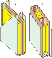 Een manier om de akoestische criteria te verenigen met de brandweerstandseisen kan eruit bestaan om de platen die zich aan weerszijden van de spouw bevinden, te verplaatsen naar de binnenzijde van de woning (zie afbeeldingen 3b en 3c) en de ruimten tussen de stijlen van elke wand op te vullen met rotswol om te vermijden dat de stijlen zouden carboniseren (rotswol heeft een smelttemperatuur van zo'n 1100 °C). Daarnaast dient men ook een van de volgende maatregelen te treffen: