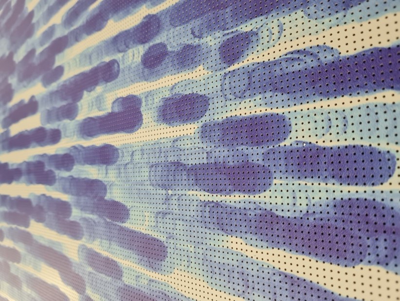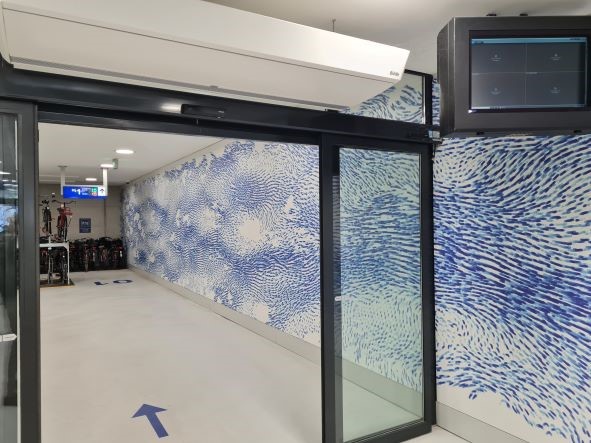 Akoestische panelen Microperfo, met digitale bedrukking blauwe vingers muurschildering, geplaatst aan ingang van grootste bewaakte fietsenstalling in Zwolle, Nederland