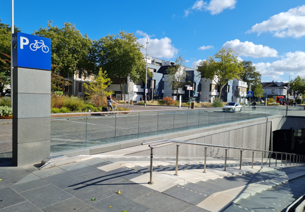 Met ruimte voor stalling van 5800 fietsen is dit meteen ook de grootste ondergrondse bewaakte fietsenstalling in de BeNeLux. De fietsenstalling is ontworpen als een stedelijk souterrain maar met goed overzicht en overvloedig licht voor optimaal comfort en veiligheid. Een akoestische gemicroperforeerde wand van Print Acoustics by Triplaco in inkomsas zorgt voor een zeer aangenaam gespreksklimaat in deze ruimte.