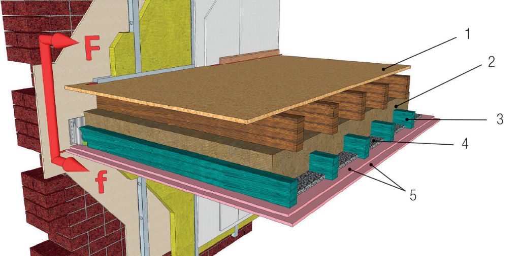 In oude woningen staan de houten vloeren vaak in verbinding met verticale, zware metselwerkwanden. Wanneer deze vloeren echter gerenoveerd worden met het oog op een akoestische verbetering, wordt de maximaal haalbare luchtgeluidsisolatie beperkt door de flankerende geluidstransmissie via deze wanden (zie pijl F-f in onderstaande afbeelding). Dit is te wijten aan het grote massaverschil tussen deze vloeren en de dragende wanden (zie WTCB-Tijdschrift 2001/1). Om een normaal akoestisch comfort te behalen, moeten doorlopende massieve wanden waarvan de oppervlaktemassa kleiner is dan deze van uit 30 cm dikke baksteen bestaande wanden (m.a.w. 390 kg/m²), op minstens één verdieping voorzien worden van een akoestisch efficiënte voorzetwand (∆Rw ≥ 12 dB, zie de WTCB-Dossiers 2013/4.14). Wanneer men een verhoogd akoestisch comfort beoogt, moet er op beide verdiepingen een dergelijke voorzetwand geïnstalleerd worden.