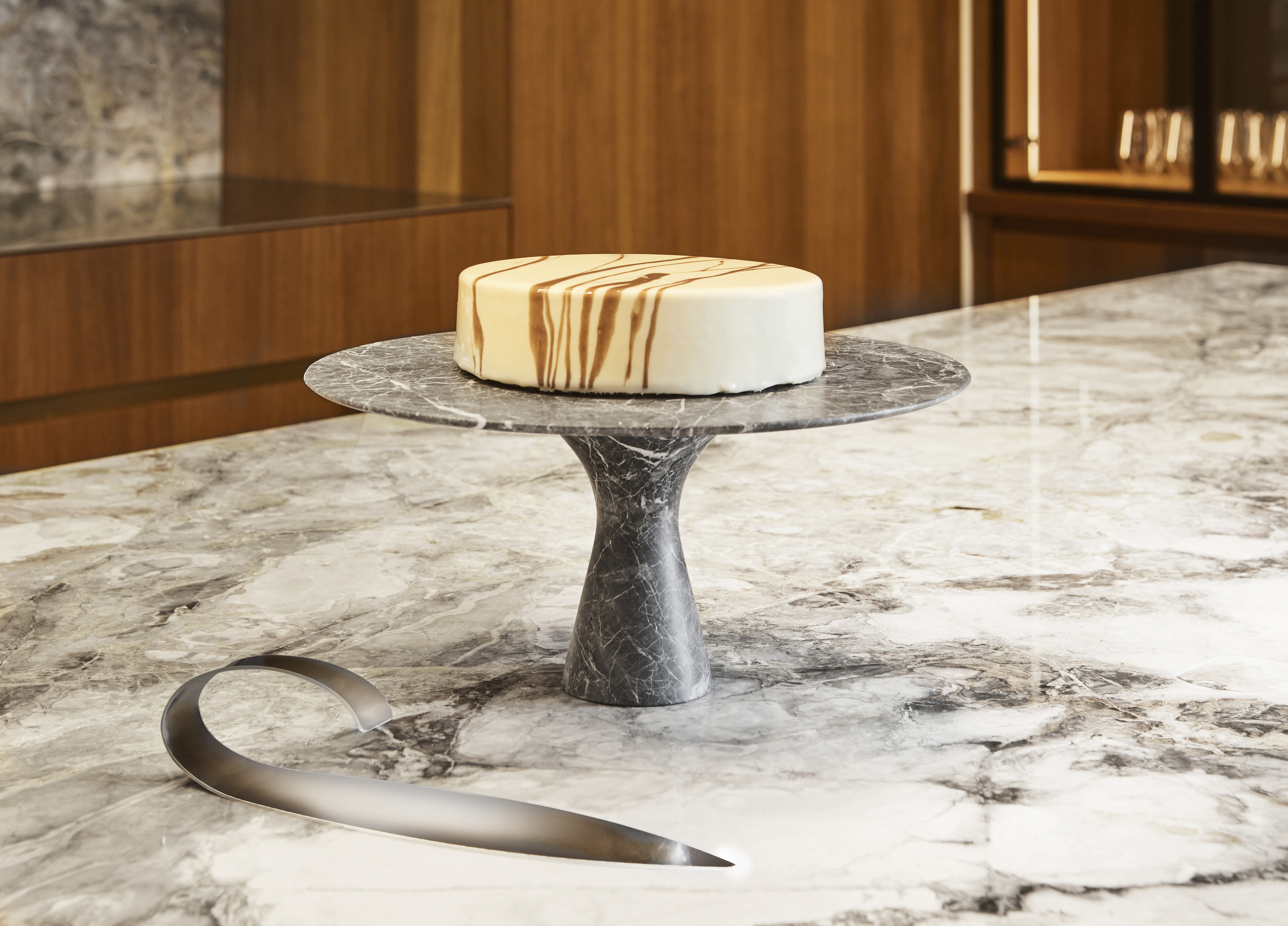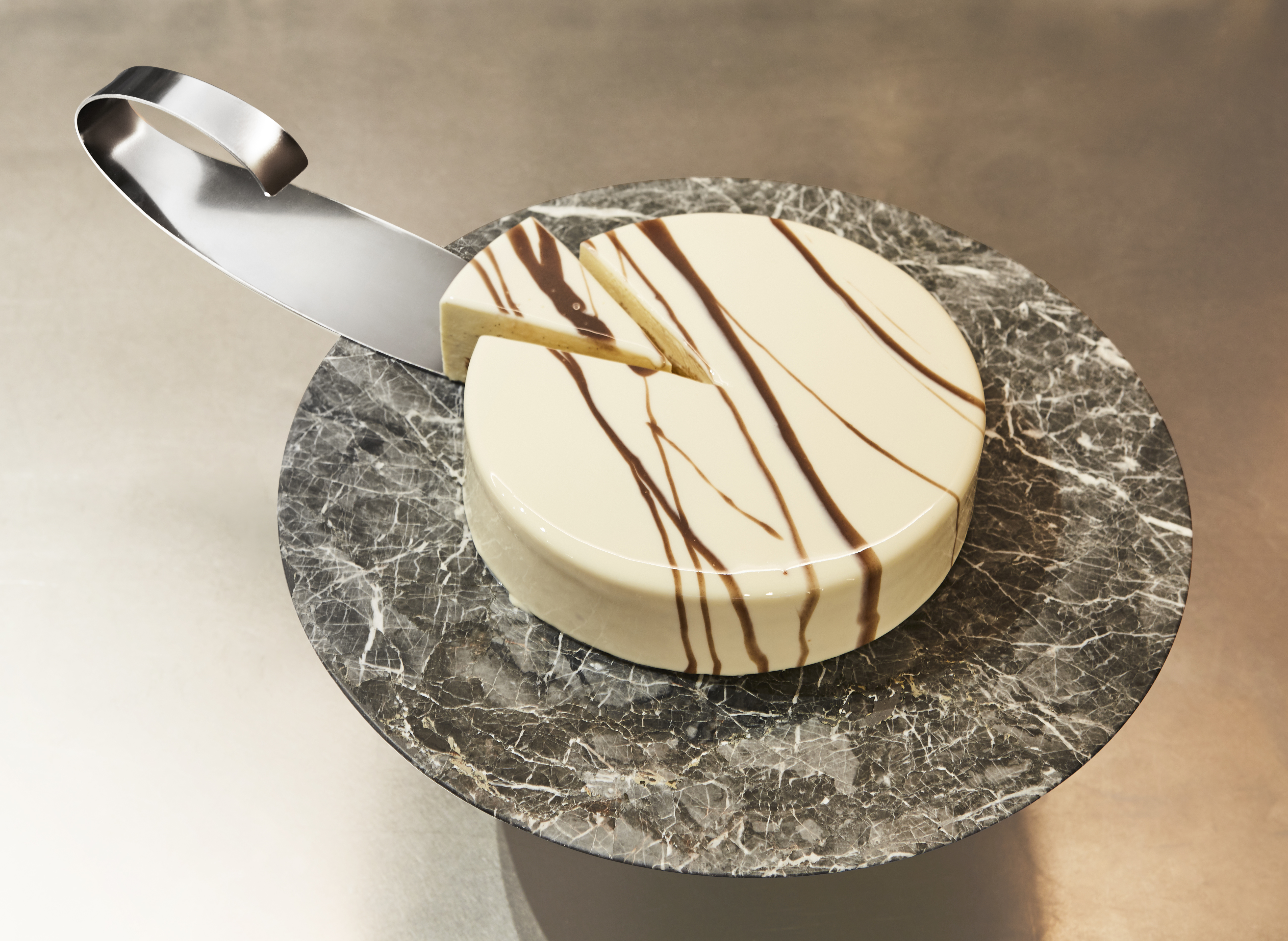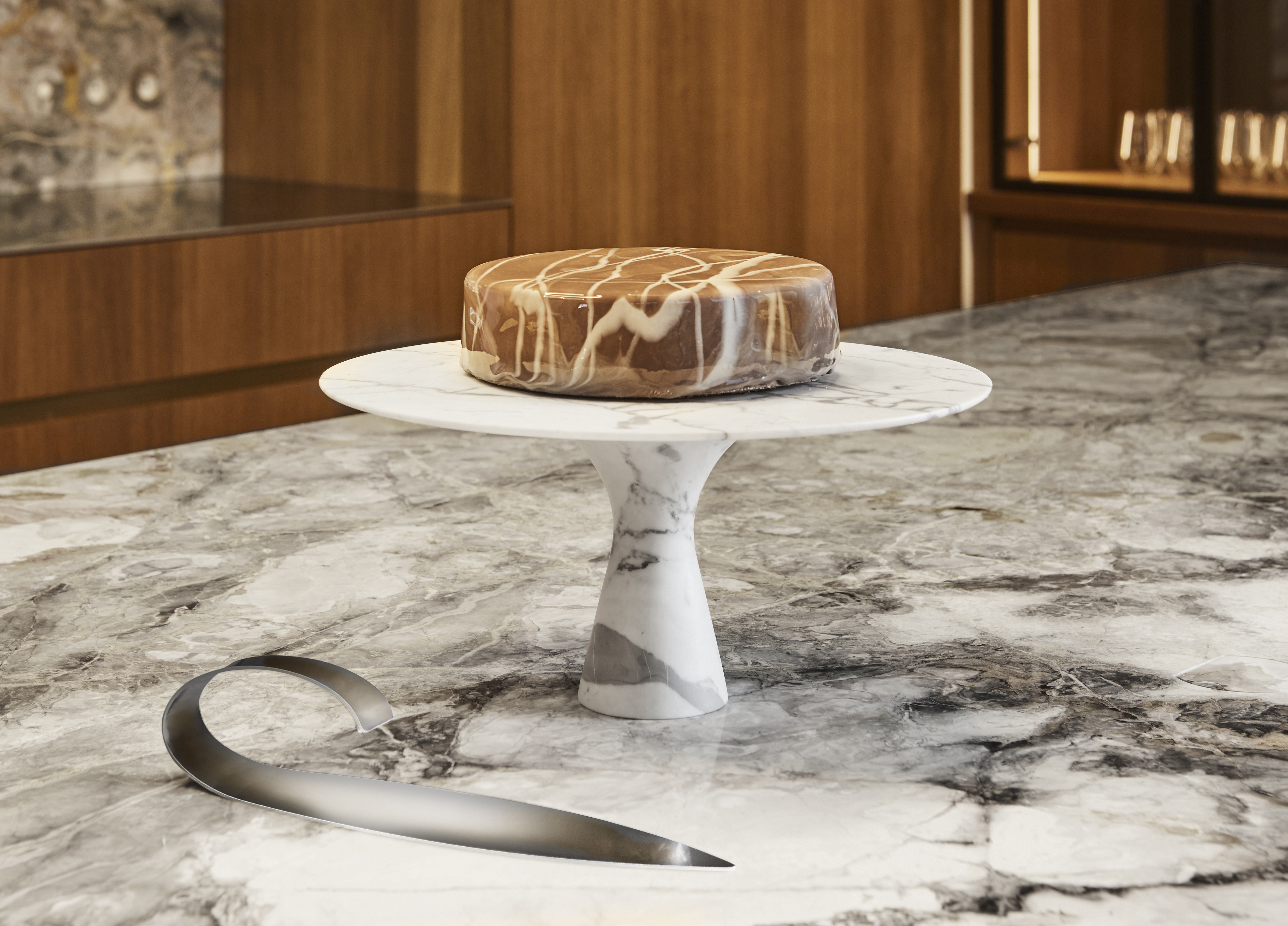 Gezien het natuurlijke karakter van marmer, heeft iedere taartschotel een unieke kleur en tekening. Om dit unieke aspect verder te benadrukken wordt iedere taartschotel gesigneerd. De onderzijde is één vloeiende curve van de voet tot de bladrand waardoor deze taartschotel één mooi geheel vormt. De slanke voet zorgt voor een elegante uitstraling en bevordert bovendien ook het vasthouden van het object tijdens het serveren. Angelo O is tevens het perfecte schaalmodel van de internationaal succesvolle marmeren eettafel Angelo M.