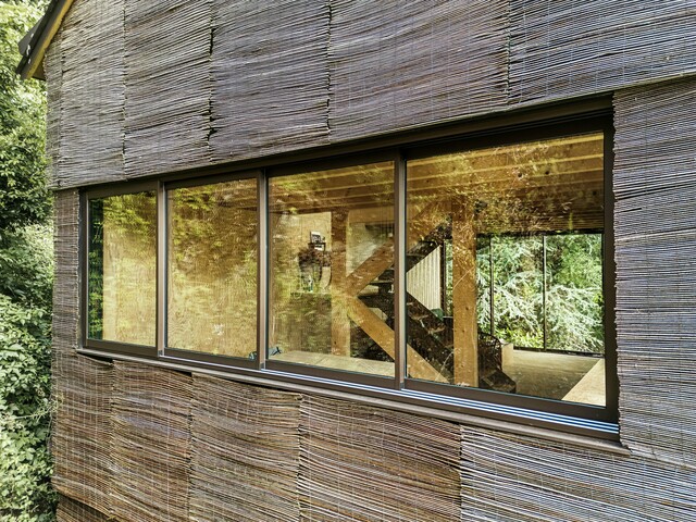 De gevel is bekleed met wilgenmatten die over een zwarte dichtfolie zijn geplaatst. Deze oplossing is goedkoop, eenvoudig te vervangen en te herstellen, en bovendien ecologisch verantwoord.
