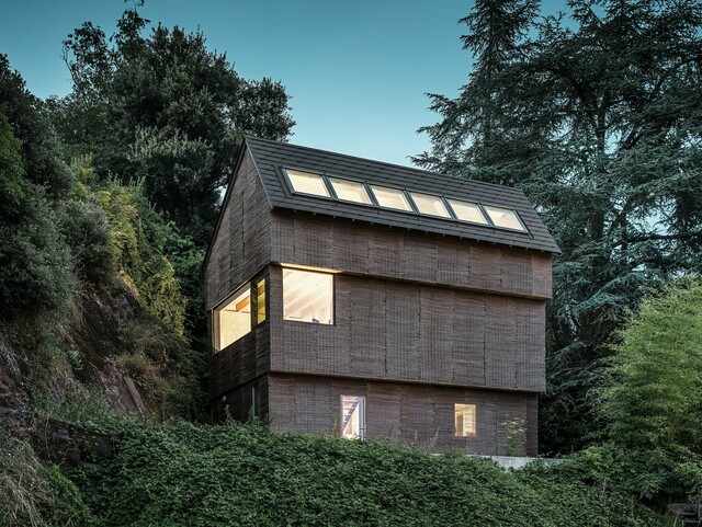 De randvoorwaarden van dit bouwproject waren verre van ideaal. Het perceel ligt aan een steile, bemoste rotswand en bevatte een gemetseld tuinhuis met een verroeste broeikas. Afbraak was geen optie, want het recht om te bouwen hing samen met het bestaande grondvlak. De architecten besloten daarom de aanwezige bebouwing verder te ontwikkelen.