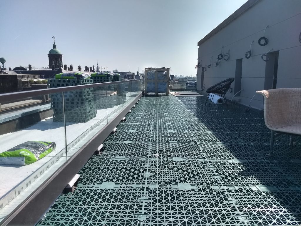 Op een wortelwerende dakdichting werd de beschermmat SSM45 aangebracht over de hele oppervlakte. Hierop kwamen de waterretentie-elementen RSX65. Deze elementen, onderling met elkaar te verbinden en met een hoogte van 65mm, kunnen tot 60l/m² bufferen en zijn zowel geschikt voor onder groendaken als voor onder loop- en rijverhardingen.