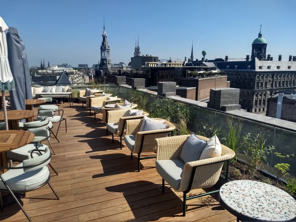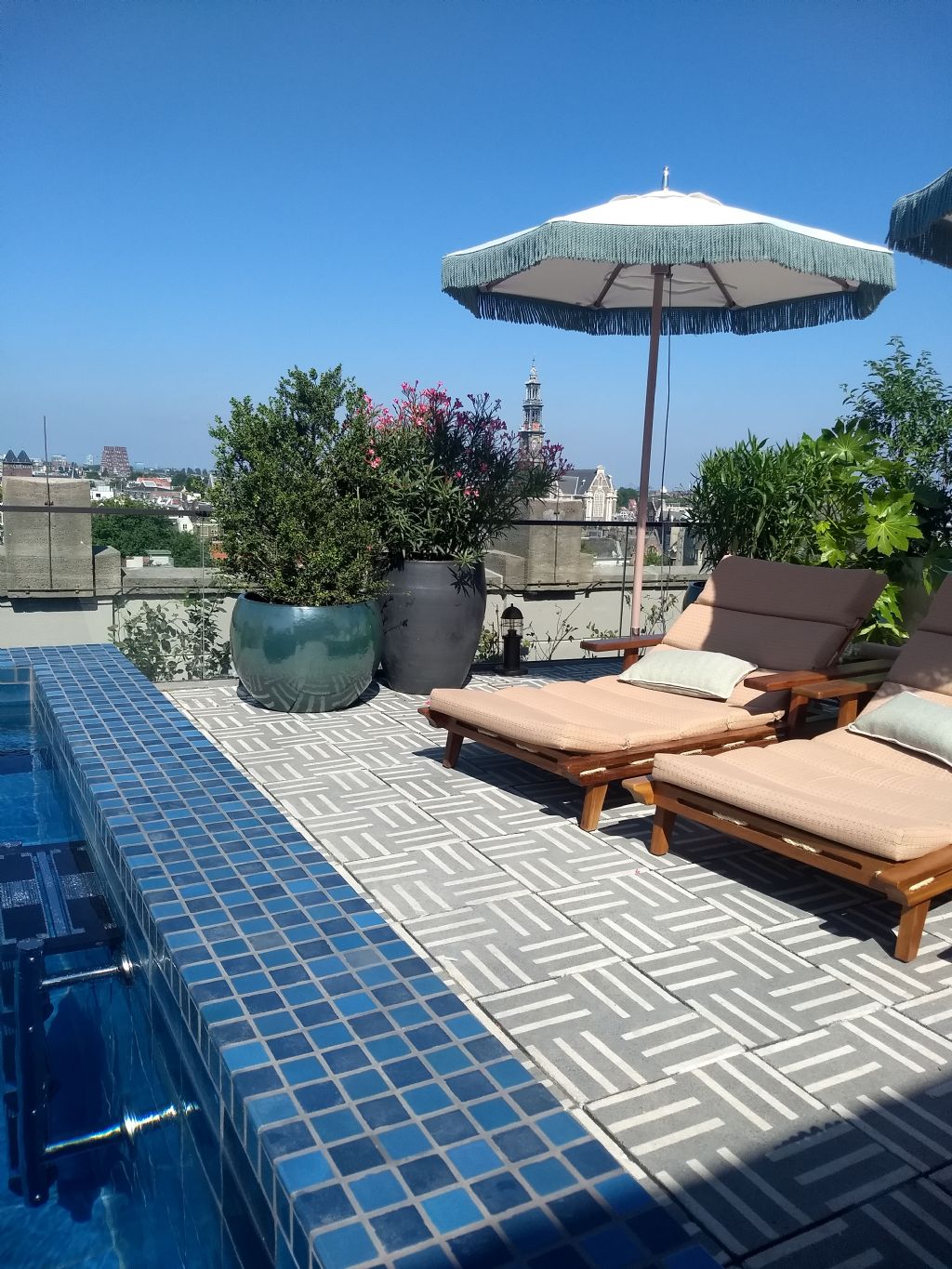 Dè blikvanger van het gebouw is echter het indrukwekkende dak, een creatie van landschapsarchitect Marnix Tavenier: een combinatie van groendaken, houten terrasvloeren, loungebar en mèt een buitenzwembad met een fantastisch uitzicht over de oude binnenstad van Amsterdam.