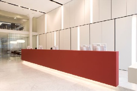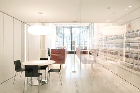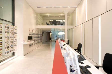 Bij het binnenkomen springt meteen de vuurrode balie in het oog in de verder volledig witte ruimte. Deze balie leidt het zicht het gebouw in, doorheen de transparante beglazing van een bespreekruimte, en versterkt zo het gevoel van ruimtelijkheid. Achteraan het gelijkvloers bevinden zich verder nog een bespreekruimte en een directievergaderzaal.