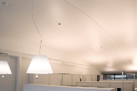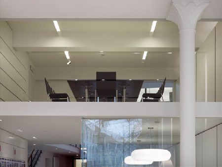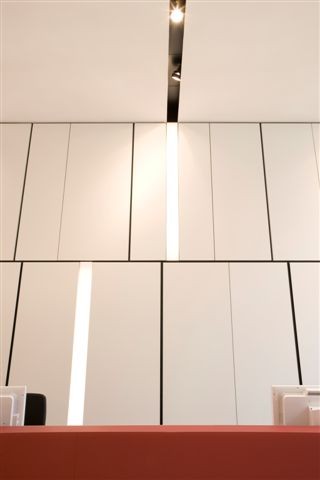 De basiskleuren wit en grijs werden vooral bepaald door de originele gemarmerde vloer, die ook in de oorspronkelijke trap was terug te vinden. De opvallende lichtlijnen die doorlopen van de wanden in het plafond maken het interieur af.