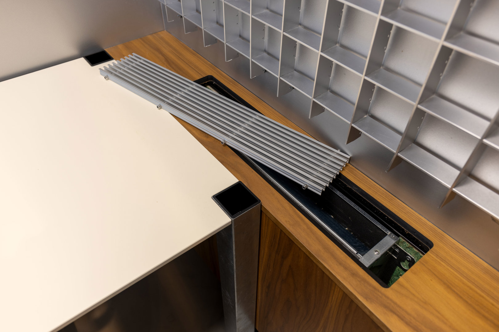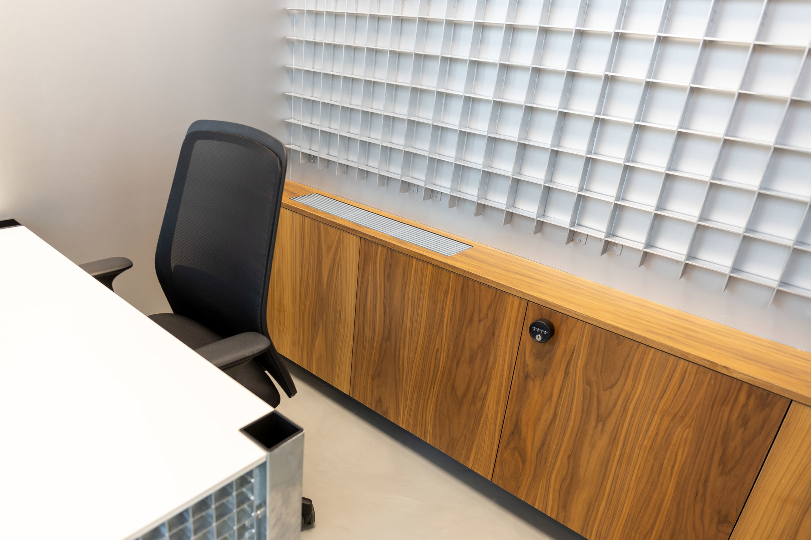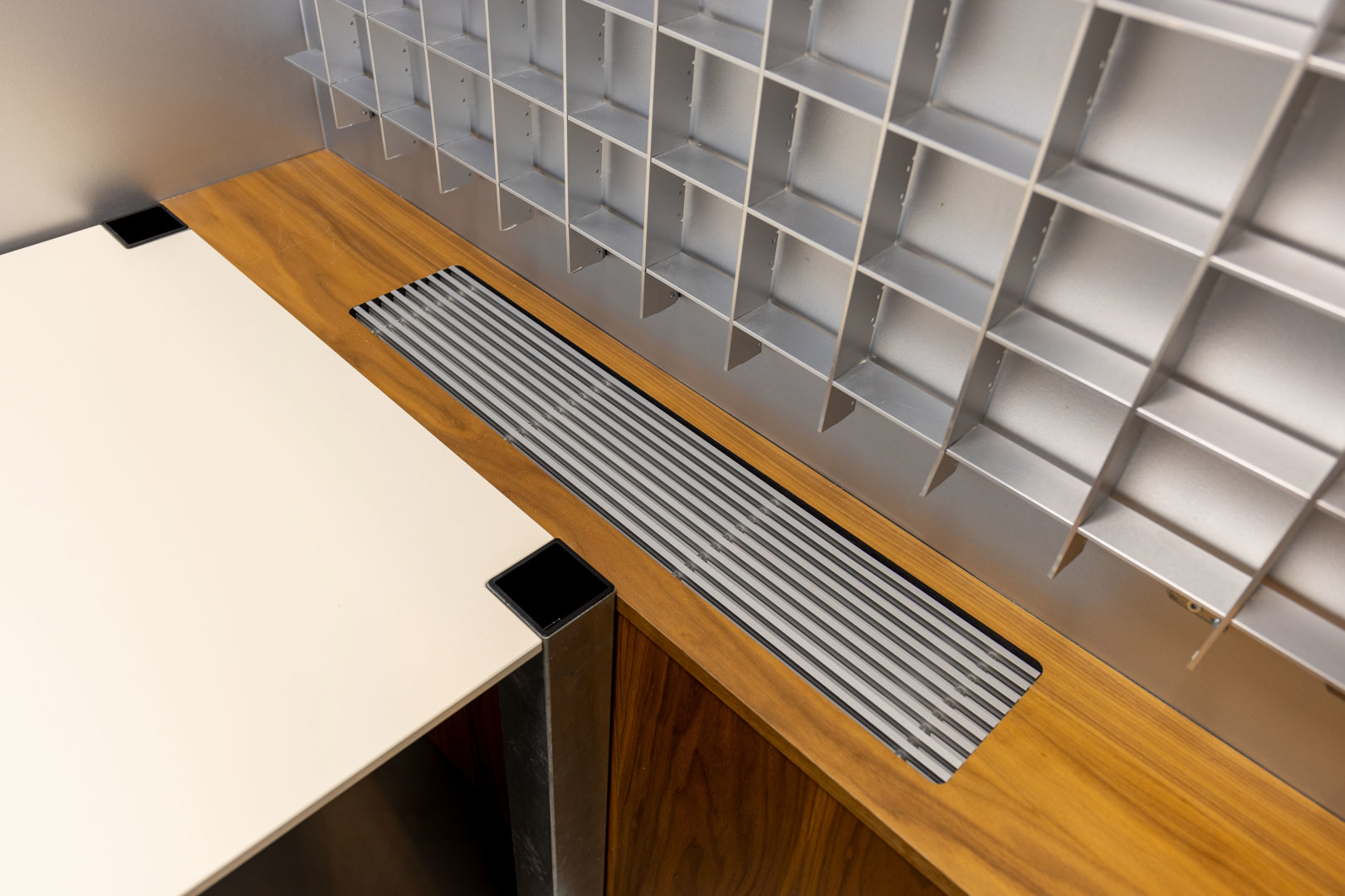 - Wandinbouw oplossing - Briza 12: superstil en naadloos geïntegreerd in de wanden van de vergaderzalen. Enkel een discreet rooster blijft zichtbaar, afgestemd op het interieur.