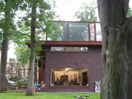 Deze woning met schildersatelier bevindt zich op een uitzonderlijk perceel met eeuwenoude bomen in het centrum van Brasschaat. Het vlinderdak reguleert kops de lichtinval tussendoor het bladerdek noordelijk voor het schildersatelier en zuidelijk voor het wonen. De transparante tussenvloeren brengen het daglicht centraal binnen. De plan- en structurele opbouw is eenvoudig en compact en maakt onderscheid tussen dienende en dienstige ruimtes waardoor verschillende woonconfiguraties mogelijk zijn. De grote leefruimte