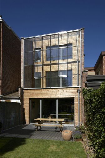 Deze eengezinswoning is opgebouwd rond een transparante centrale kern (hout), welke omsloten wordt door twee rechthoekige massieve volumes (gevelsteen). Het verschil tussen deze twee volumes wordt extra geaccentueerd door de materiaalkeuze.