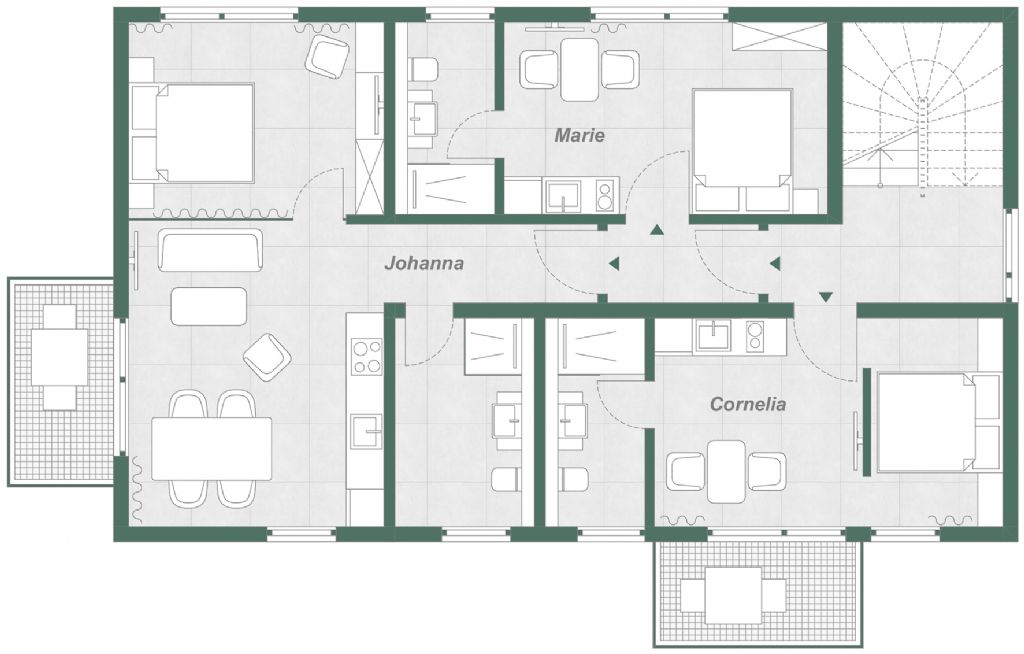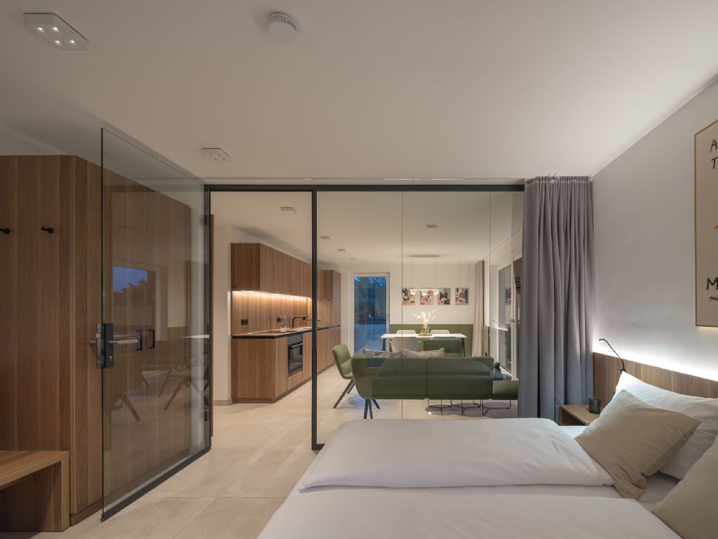 Hier, in het schilderachtige gebied rond de Kaiserstuhl en niet ver van de universiteitsstad Freiburg, behoren ook toeristen met affiniteit voor design tot de doelgroep. Alle zeven één- en tweekamerappartementen - met oppervlaktes tussen de 20 en de 50 m² - hebben een patio of balkon, zijn efficiënt ontworpen en comfortabel met hoogwaardige materialen, maar toch robuust vormgegeven. Bovenal zijn ze uiterst functioneel. Daarvoor zorgen doordachte details die op slimme wijze meer leven per vierkante meter mogelijk maken. Twee appartementen op de eerste verdieping kunnen ook worden gebruikt als een gekoppeld appartement van 70 vierkante meter met drie slaapkamers.