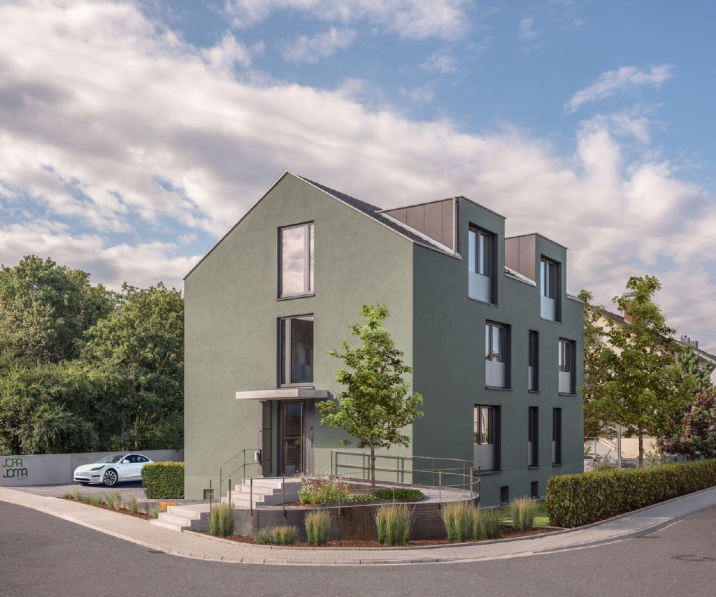 In het stadje Kenzingen in Baden hebben Christoph en Stephan Schmidt om de hoek van hun architectenbureau een modern huis met drie verdiepingen gebouwd. Het dubbel hellende dak met de petrolgroene gepleisterde gevel en de markante dakkapellen valt op in de structureel homogene woonwijk, zonder dominant of zelfs opdringerig over te komen.