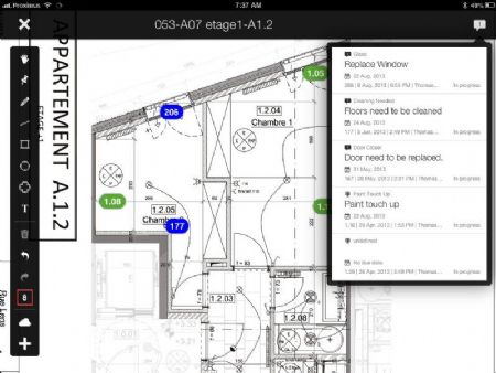 AproPLAN is een applicatie voor iPad, iPhone (binnenkort ook Android) en computer die architecten en igenieurs moet helpen bij het maken van werf- en opleveringsverslagen. Met behulp van deze app plaats je de plannen per project in de cloud. Met je verschillende toestellen – computer, iPad en iPhone– kan je dan die plannen raadplegen op de server. Zo heb je op de werf altijd de laatste versie van je plannen op zak. Dankzij een krachtig inzoommechanisme kan zelfs op de kleinste details van de plannen geconcentreerd worden. Opmerkingen over een deel van een plan voeg je toe met een simpele tik. Maak een foto, voeg een opmerking toe en sla hem op. Een enkele muisklik in de webapplicatie op je computer achteraf volstaat om een verslag te genereren en te versturen naar de betrokken partijen.