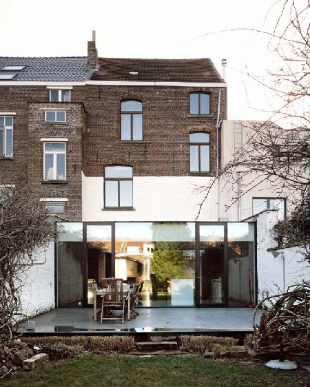 De bestaande uitbouw die was opgedeeld in meerdere kleinere ruimten werd volledig opgetrokken inclusief de achtergevel die volledig werd gesloopt en een integrale gevelgrote beglazing kreeg. Hierdoor creëerde Archiblau veel ruimte en werd het zichtcontact met de tuin optimaal. Om de middelste ruimte (bibliotheek) goed te kunnen verlichten werd in het dak, aansluitend tussen hoofdgebouw en de aanbouw een vlakke gevelbreedte lichtkoepel geplaatst.