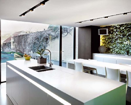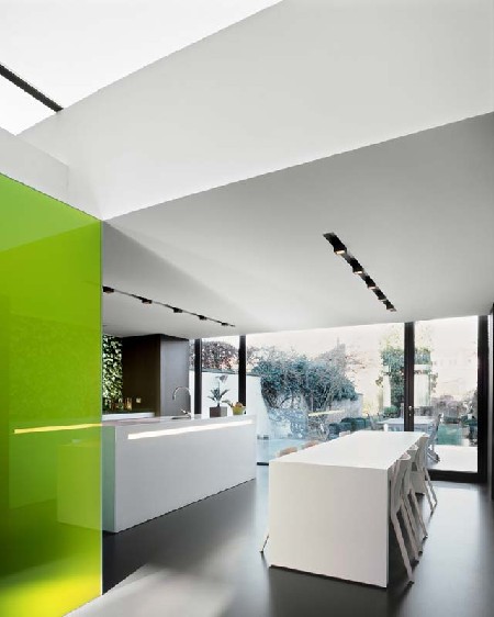 Als opvallende materialen en technieken zijn onder meer de kaderloze ramen, de cementgebonden gietvloeren, het naadloos meubilair (pral) en de kaderloze glazen volumes (groen blok) het vermelden waard.