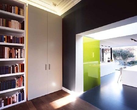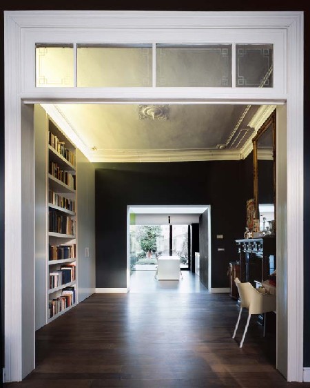 De ontwerpers kozen er voor om de ingang naar het salon te accentueren, een zicht-aslijn te creëren naar de keuken vanuit de bestaande gang en het contact met de tuin te verruimen. Hiervoor was het onder meer nodig de opening tussen bibliotheek en living breder en hoger te maken, de doorgang onder het trapbordes helemaal open te maken, alle binnenmuren in de uitbouw te slopen en te kiezen voor hedendaagse en warme materialen met een tijdloos karakter. De bestaande vloeren, moluren, verlichting en glazen deuren in de gang werden behouden.