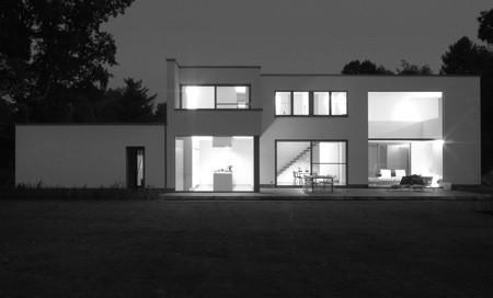 HB: Een privéwoning ontworpen door architecte Anja Vissers. De avondopname geeft zowel een zicht op de vormen van het exterieur als een inkijk in het interieur.