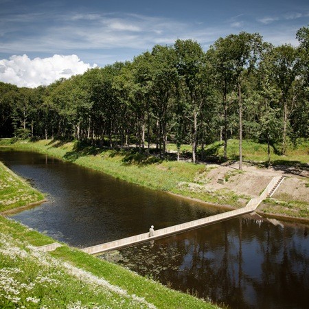 Loopgraafbrug: Een constructie van de Nederlandse architecten Ro&Ad. Zij werden bij de reconstrucutie van het historisch Fort de Roovere gevraagd om het geheel toegankelijk te maken. Hun ontwerp was geniaal in zijn eenvoud. Bezoekers lopen, zoals Mozes, door het water naar de overkant.
