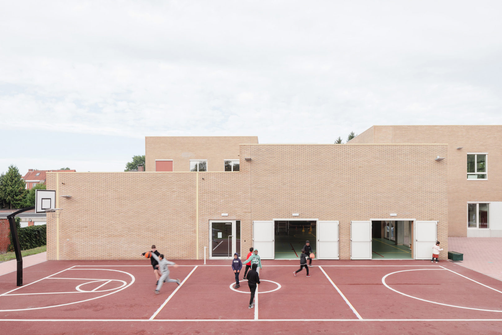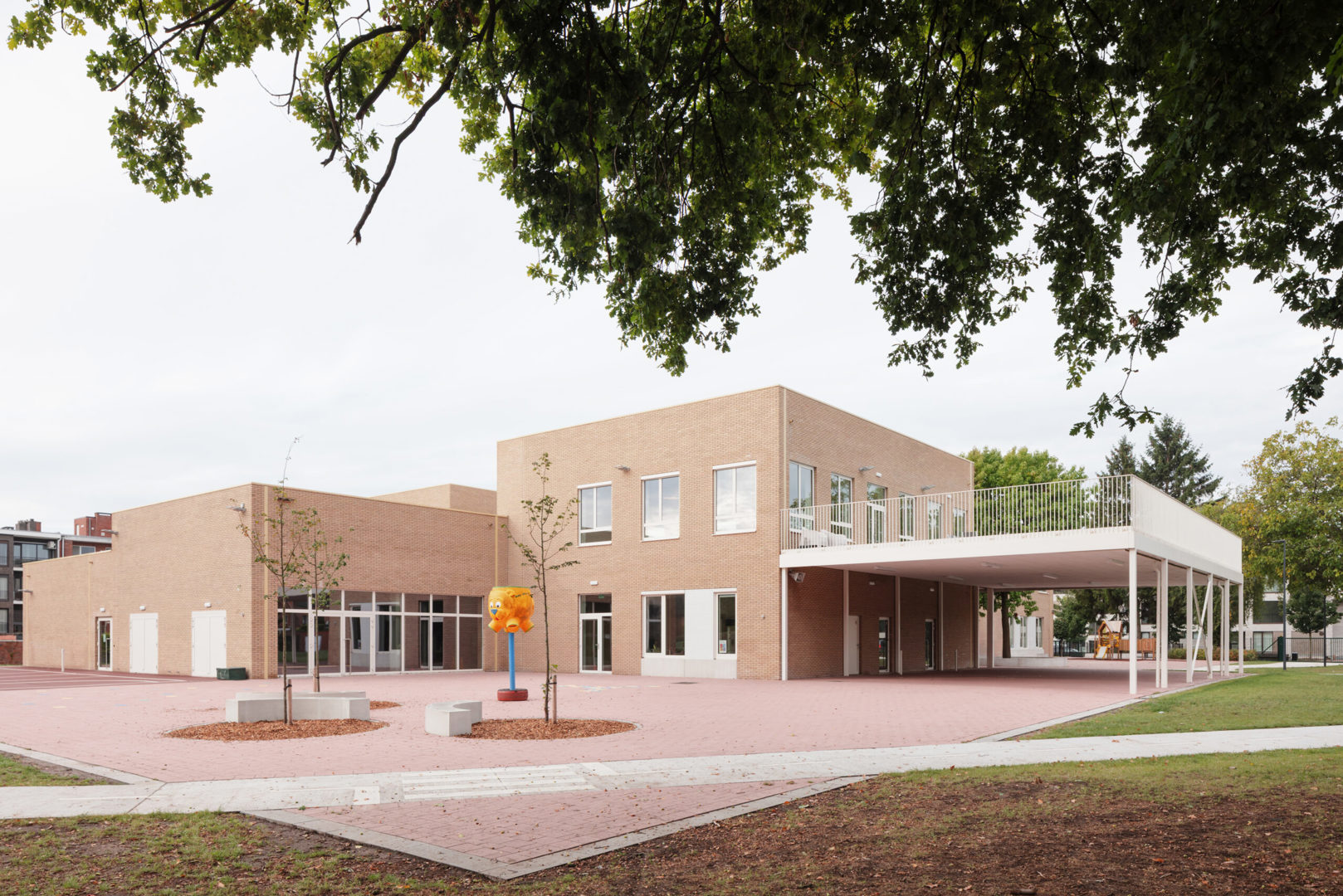 De architectuur zoekt bewust aansluiting bij de schaal van de omgeving en die van het kind. De schakeling van compacte volumes voorkomt een massieve indruk en zorgt voor een leesbare opdeling van het programma. Een zandkleurige gevelsteen geeft het gebouw een warme, rustige uitstraling, terwijl grote glaspartijen op het gelijkvloers het contact tussen binnen en buiten versterken. Zo blijft het spelende leven van de school zichtbaar en voelt de school zich ingebed in haar omgeving.