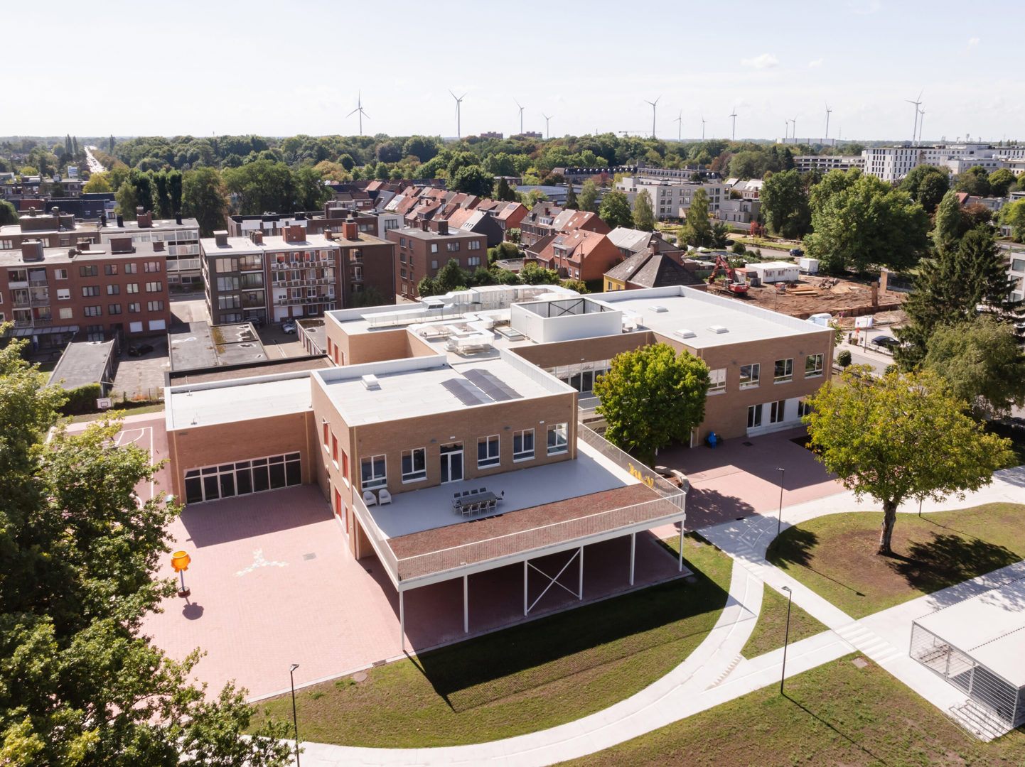 De oude, verspreide schoolgebouwen maakten plaats voor één compact volume van twee bouwlagen, ingeplant aan de rand van het perceel. Die positionering houdt het midden van de site maximaal vrij en levert een ruime, groene speel- en ontmoetingsruimte op. Door die ontwerpkeuze kan de school zich ook naar de buurt toe openen en blijft de site flexibel voor mogelijke toekomstige uitbreidingen of aanvullingen.