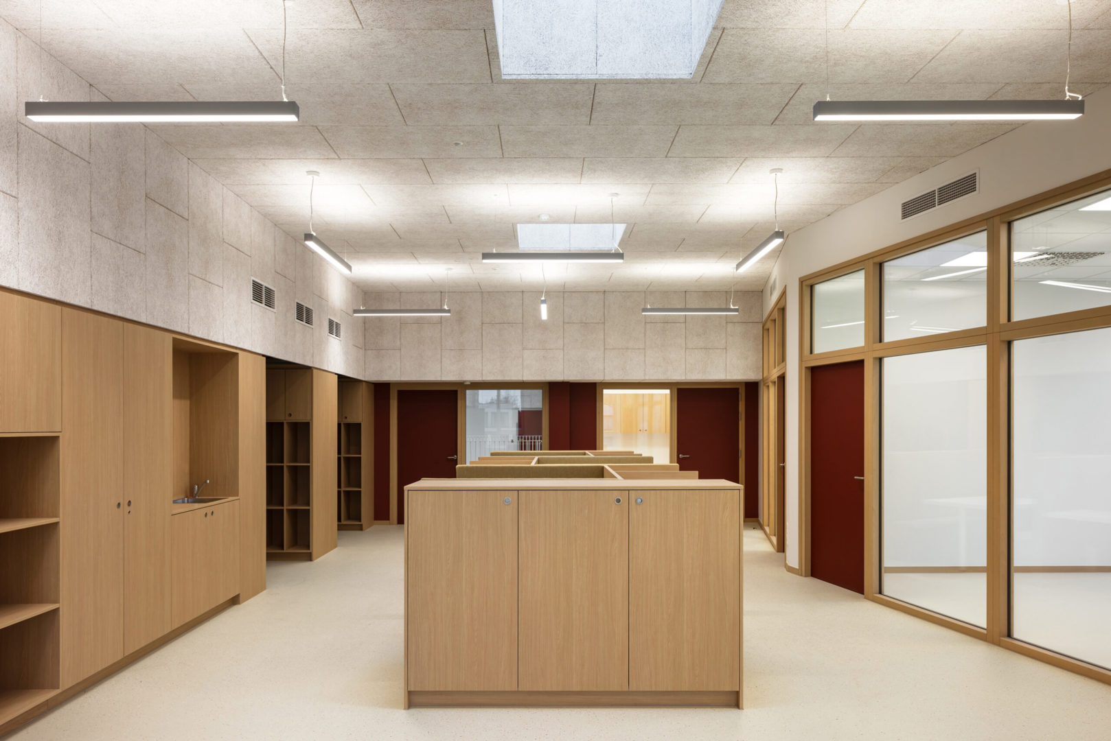 Ook het interieur is rechtstreeks afgestemd op de onderwijsvisie van VONK. Klassieke klaslokalen maakten plaats voor leerpleinen, waaromheen kleinere instructieruimtes zijn georganiseerd. Die opzet ondersteunt het werken in clusters en “teamteaching”, waarbij leerlingen van verschillende leeftijden samen leren. Door te besparen op administratieve ruimtes en directiekantoren ontstaat extra plaats voor de leerlingen en voor flexibel gebruik.