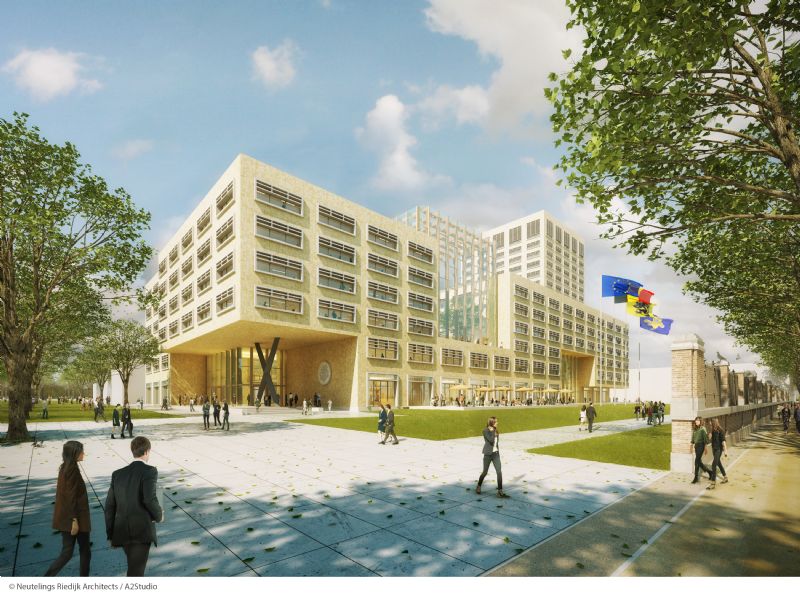 "Om die uitdagingen het hoofd te bieden hebben we een hybride gebouw ontworpen. Niet één groot blok, maar een laagbouwdeel rond vier grote binnentuinen die publiek toegankelijk zijn en een grote binnenstraat met restaurants, expositiealen en auditoria. Dat zorgt voor een publieke kwaliteit op het gelijkvloers en dat straalt uit naar buiten. Vervolgens heb je een kantoorgebouw waar de mensen rond de binnentuinen werken en Het Nieuwe Werken toepassen. Niet iedereen zit in een hokje, maar mensen kunnen werken in verschillende teams en sferen, zittend of staand, apart in cockpits of juist in creatieve teamruimtes. Dat stimuleert een andere manier van samenwerken en dat leidt tot betere prestaties."
