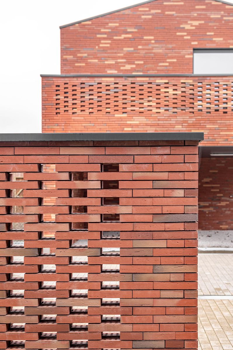 Er werd claustra metselwerk toegepast bij de borstwering van de terrassen op de verdieping van de huurwoningen en bij de tuinmuurtjes van de koopwoningen. Dit zorgt voor een speels element in het straatbeeld en maakt dat er toch bij het gebruik van de tuintjes en de terrassen betrokkenheid is naar de straat toe.