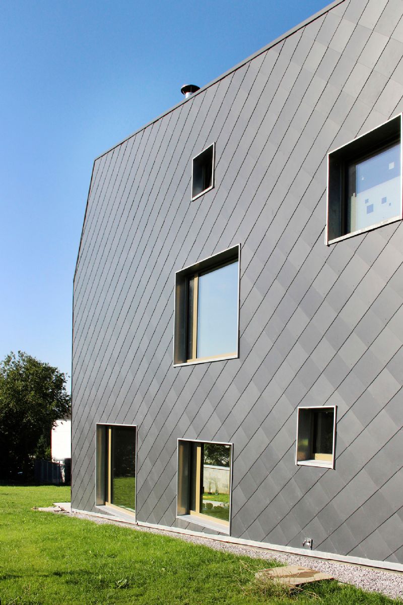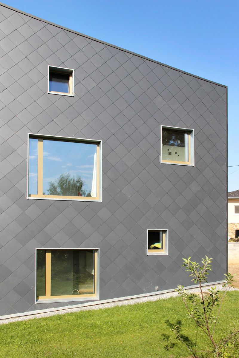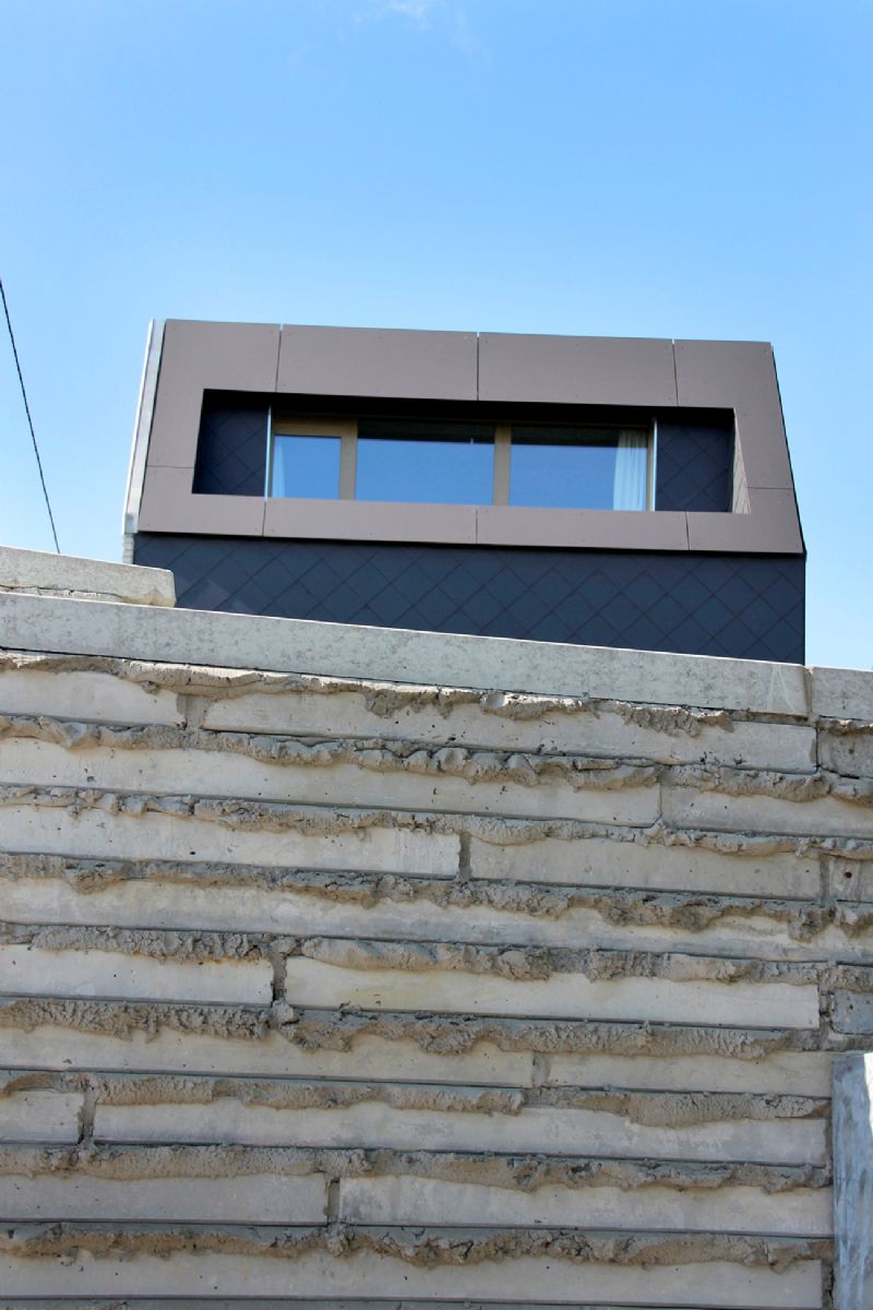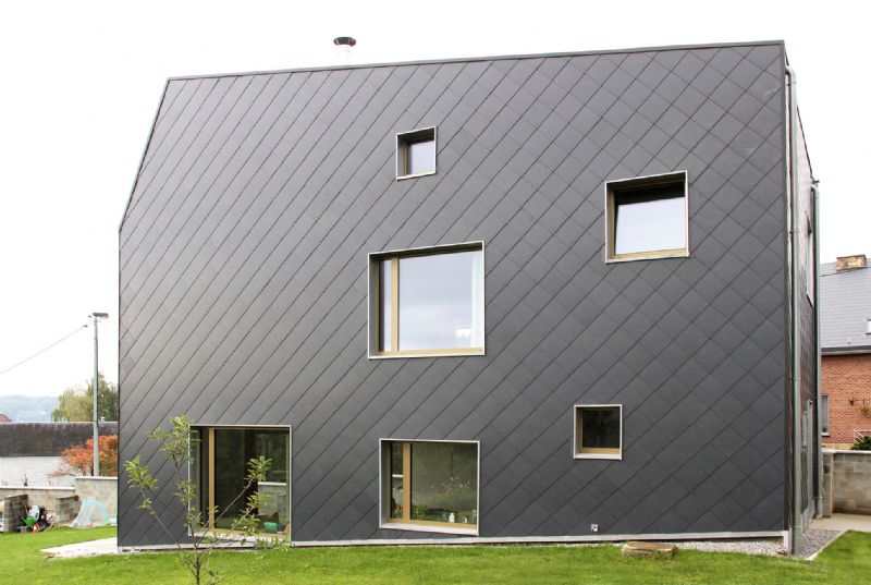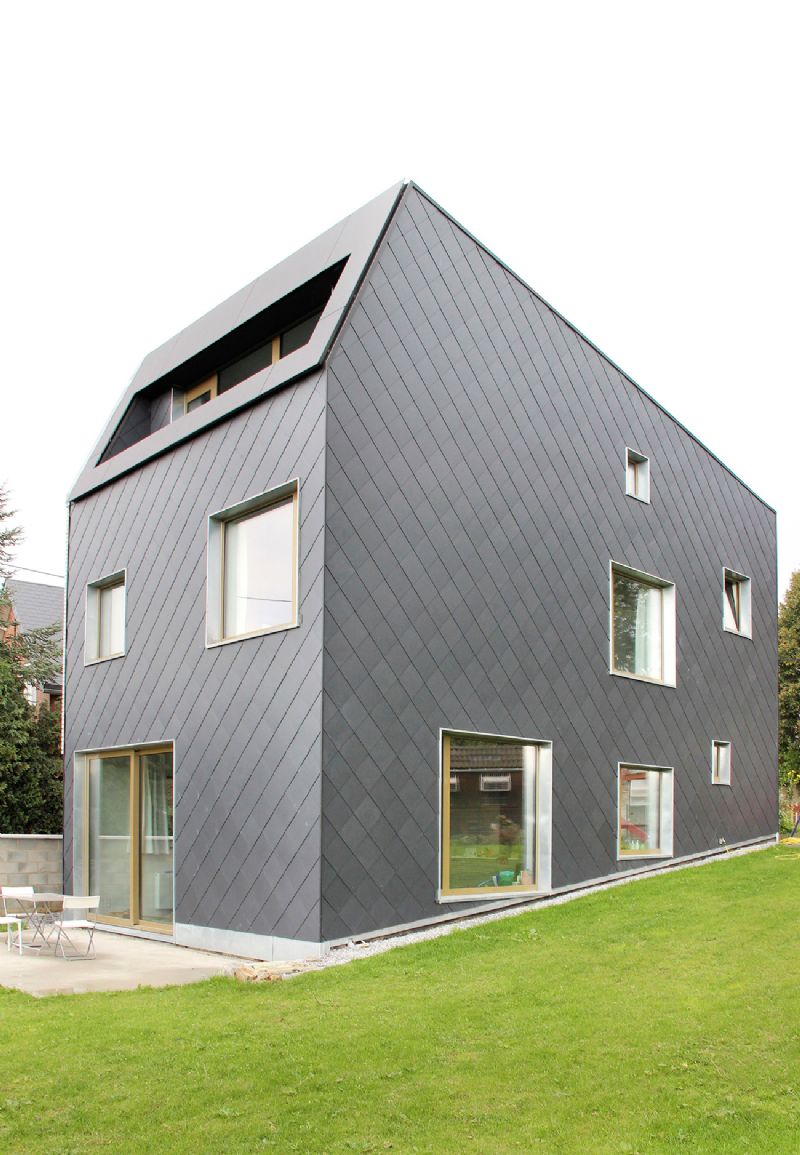 De donkergrijze ruitvormig geplaatste leien van Eternit geplaatst in dambordpatroon, vormen de eenvoudige buitenschil. Ze zijn de tegenpool voor de sterke horizontale belijning van de betonnen lintelen die de woning dragen en op de bestaande walmuur werden geplaatst.