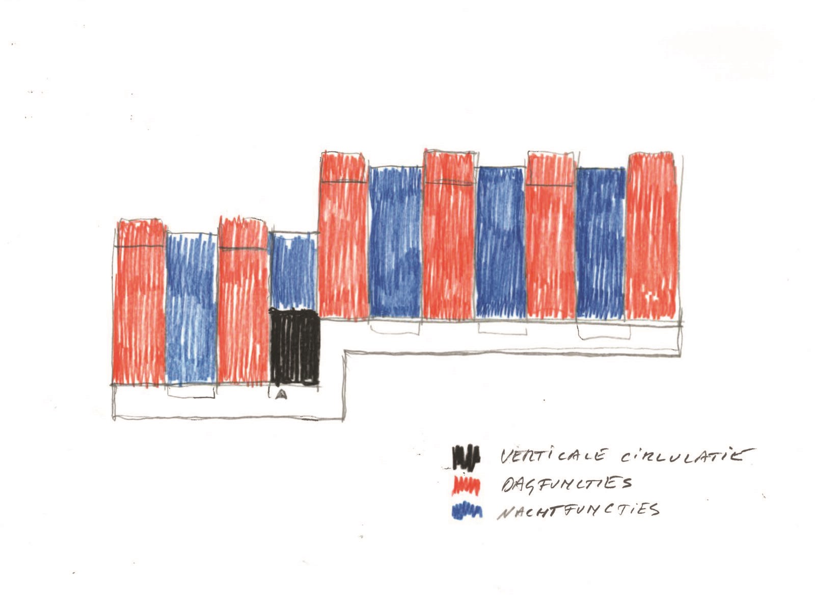 Vervolgens moest ook de verticale circulatie binnen het appartementsgebouw op een cruciale plaats staan en in staat zijn het volledige bouwblok te bedienen, ongeacht de samenstelling en opstelling. De keuze waarbij trap en lift centraal in het bouwblok staan en waarbij interne circulatie de appartementen bedient, leek het ontwerpteam weinig flexibel. Meestal resulteert dit in een beperkt aantal appartementen per bouwlaag of tot een bouwblok met grote bouwdieptes en verschillende geveloriëntaties of tot interne gangenstelsels die weinig belevingswaarde hebben. Om dit te vermijden kozen de ontwerpers voor een galerij die bediend wordt door een trap (en lift) die ofwel in het bouwblok geïntegreerd zijn ofwel in de galerij zelf verwerkt kan worden.