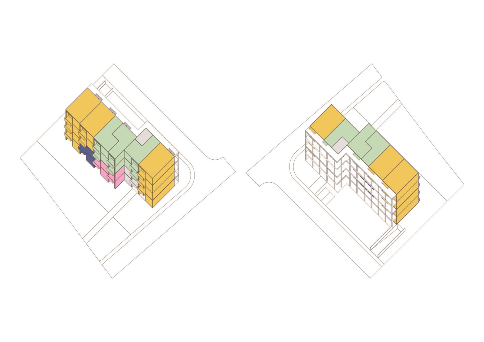 Van dorp tot stedelijke context of ergens tussenin, vrijstaand of aansluitend op een bestaande gebouwen, kleinschalig tot grootschalig, laagbouw tot zelfs middelhoogbouw tot 7 bouwlagen: met het concept van Architectenbureau Bart Dehaene en Sileghem & Partners is een grote diversiteit aan sociale appartementsgebouwen mogelijk, die de verschillende bouwmaatschappijen toelaat hun programma in te vullen in functie van de lokale woonbehoeftes en beschikbare bouwterreinen.