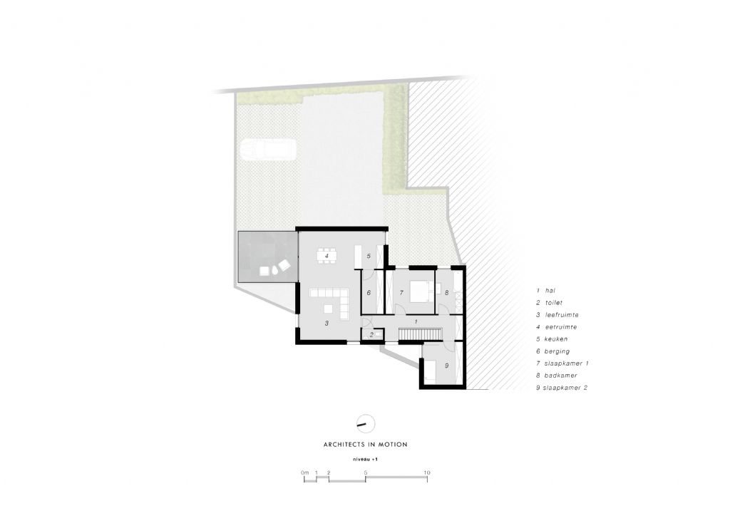 De toegang tot de stadspaalwoning is naast de ingang van de parkeerzone voorzien, tegen de aanpalende woning. Op de eerste verdieping die gedeeltelijk in overkraging over de Hofpoort gebouwd werd, zijn er naast een grote zit- en eetruimte, met open keuken en berging, ook twee slaapkamers met badkamer voorzien. Opvallend is het grote terras dat uitkijkt op het parkje wat een extra sociale controle impliceert.
