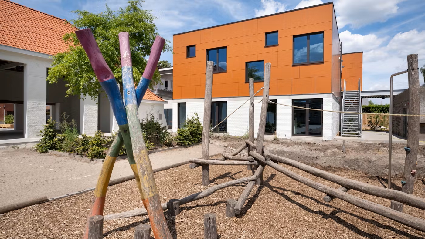 Parallel aan de renovatie wordt ook de speelplaats volledig heraangelegd. In deze laatste fase ligt de nadruk op ontharding en groene belevingshoeken die spel, natuur en creativiteit stimuleren. De grens tussen binnen en buiten vervaagt: de speelplaats wordt een volwaardige leeromgeving die ook buiten de schooluren dienstdoet als buurtplek. “We wilden een omgeving creëren waar kinderen zich vrij kunnen bewegen, ontdekken en experimenteren,” aldus Ann Geudens. “Dat maakt leren vanzelfsprekender en speelser.”