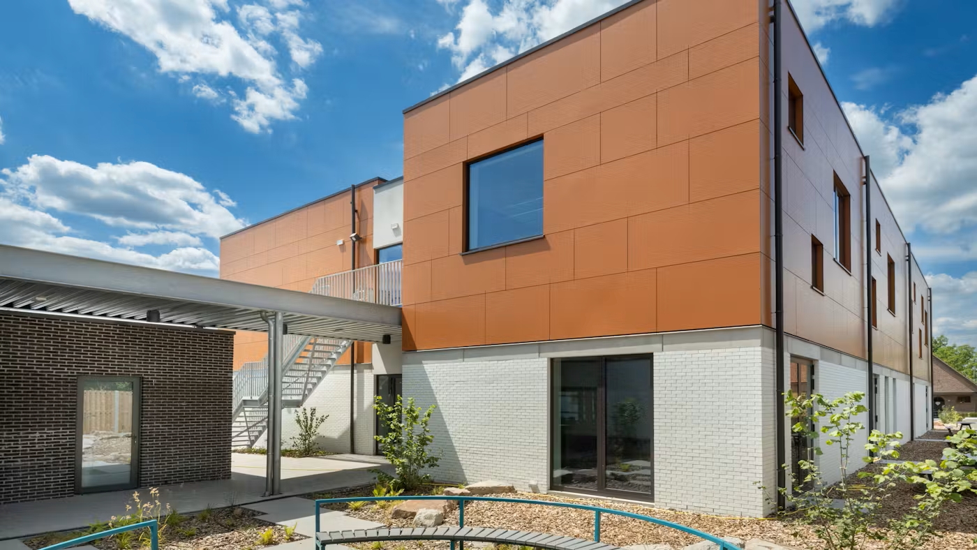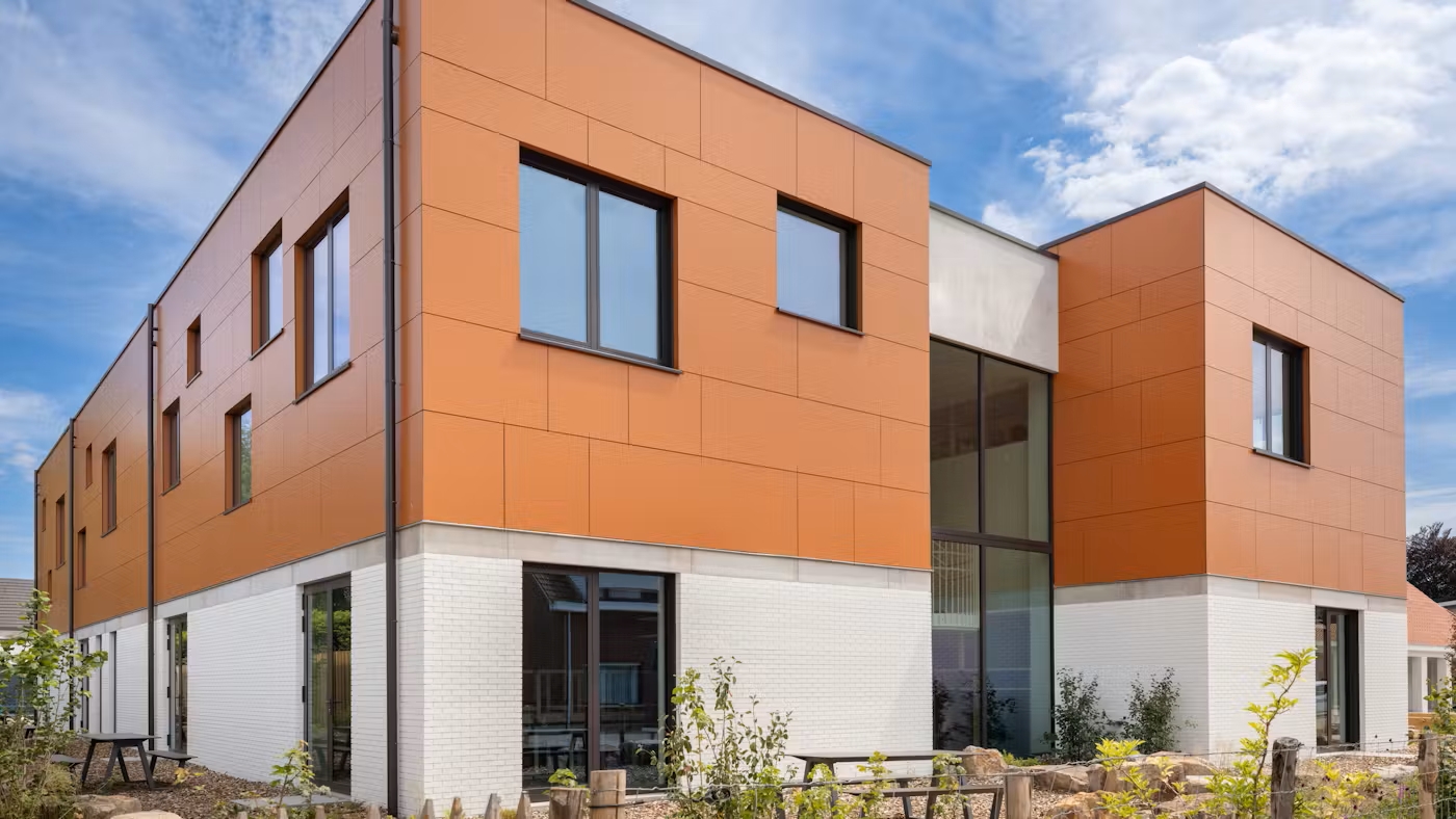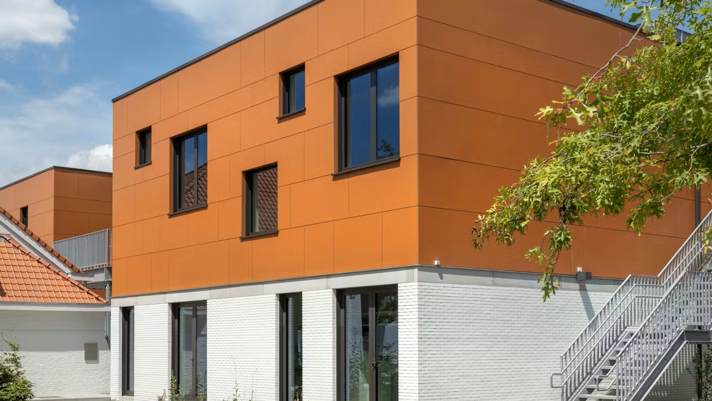 De nieuwbouw is ontworpen als een natuurlijke aanvulling op de gerenoveerde gebouwen. “De benedenverdieping kreeg witgeschilderd metselwerk, gecombineerd met oranje gevelpanelen die verwijzen naar de originele dakpannen,” vertelt Geudens. Het resultaat is een harmonieuze dialoog tussen oud en nieuw, waarin materialen, kleur en schaal perfect op elkaar aansluiten. De gevels ogen fris en speels, met ramen van verschillende groottes en een ritmiek die aansluit bij het kinderlijke perspectief.