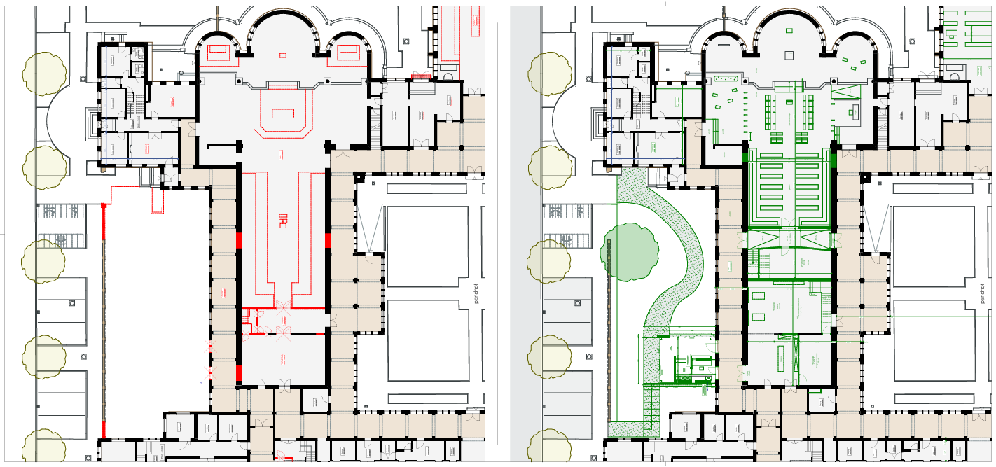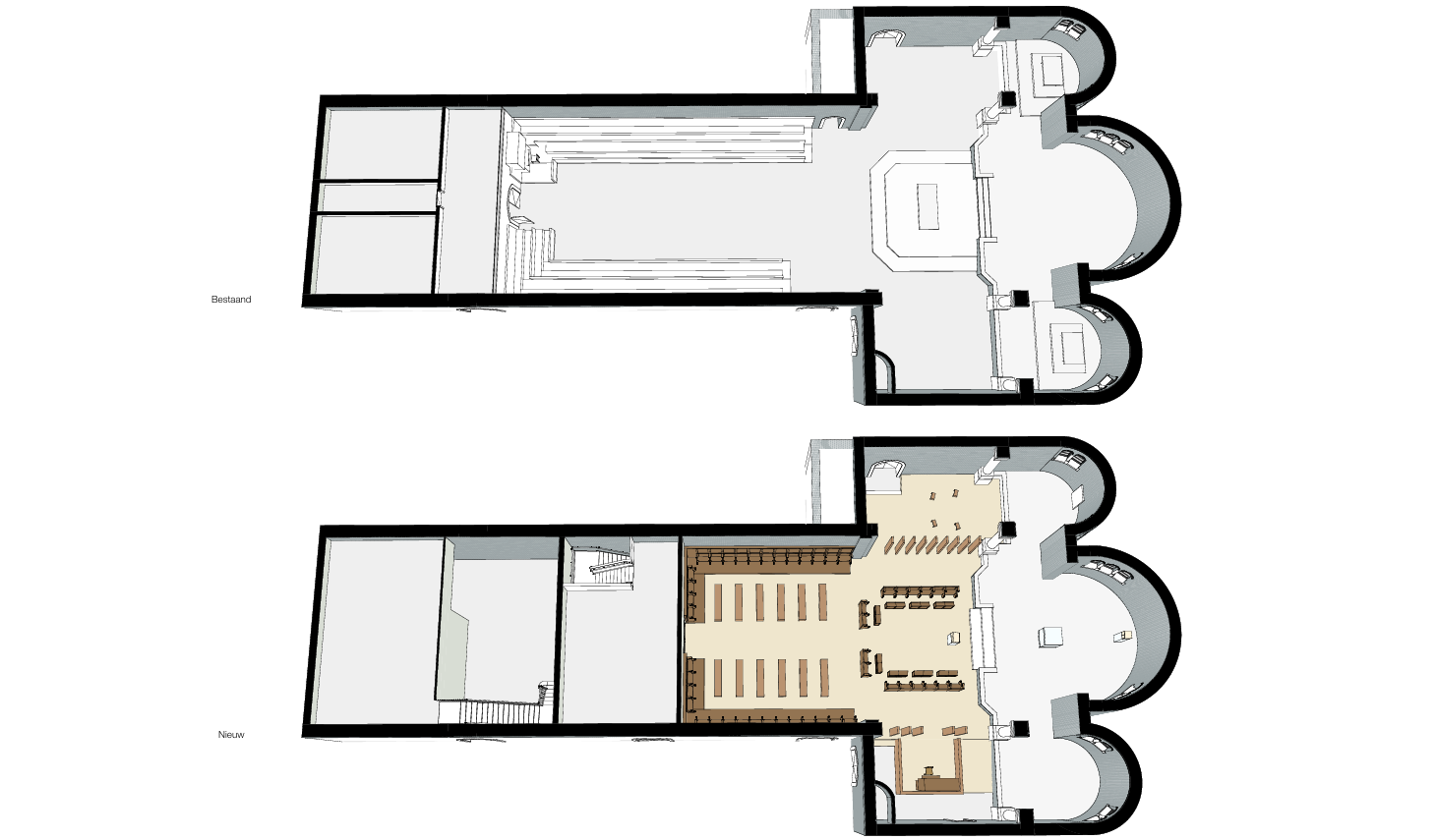 AIM werkte het ontwerp voor de Abdij van Brecht volledig uit in Archicad, waardoor de communicatie met aannemers en opdrachtgevers als vanzelfsprekend verliep. “Dankzij functies als de Renovatietool, Graphic Overrides en 3D-documents was vlot duidelijk wat er precies te gebeuren stond”, licht projectarchitect Didier Fleerakkers toe. “We deelden het model op in bestaande toestand, sloop en nieuw toe te voegen elementen, waarna elke bouwlaag overzichtelijk werd gepresenteerd met kleurcodes voor bijvoorbeeld nieuwe wanden, te verplaatsen meubilair en brandwerende scheidingen.”