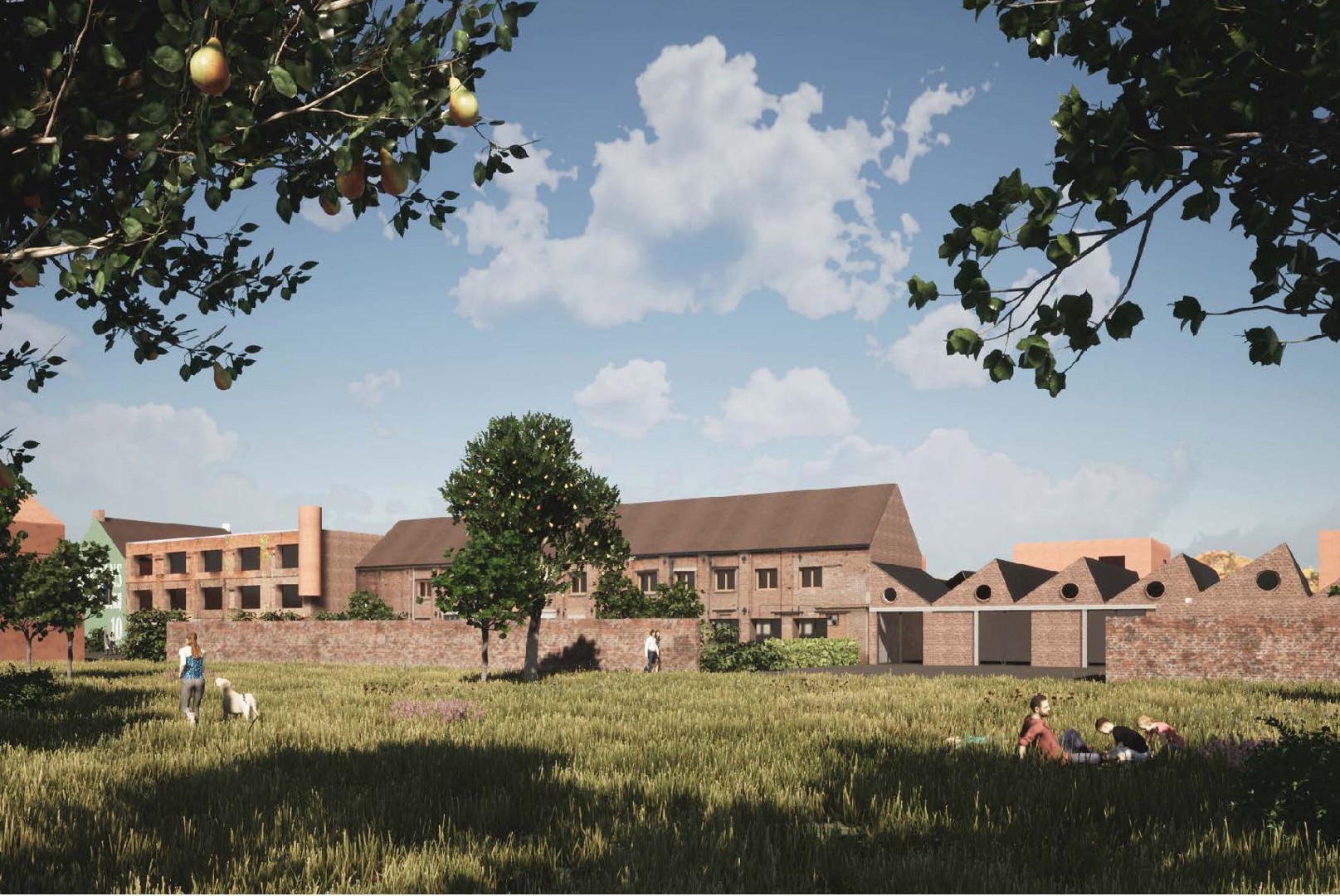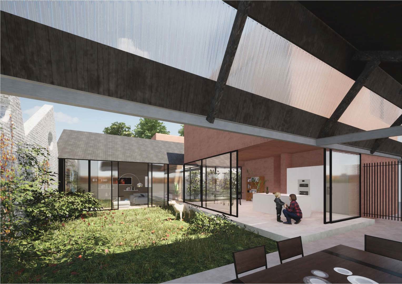 De organisatie van de buitenruimte is gestoeld op een collectieve boomgaard die de verschillende deelpercelen fysiek en sociaal met elkaar verbindt. Deze groene zone biedt de achttien gezinnen ruimte voor ontmoeting en collectieve functies zoals een gemeenschappelijke tuin en composthoop. Slimme bufferzones tussen de publieke route en de private terrassen zorgen voor een zachte overgang die de rust voor de bewoners garandeert. Bij het bouwproces wordt bovendien rekening gehouden met de natuur, onder andere met specifieke nestgelegenheden in zowel de oude als de nieuwe gevels. Daarnaast worden de onbebouwde delen van het terrein maximaal ingezet om de lokale biodiversiteit te stimuleren.