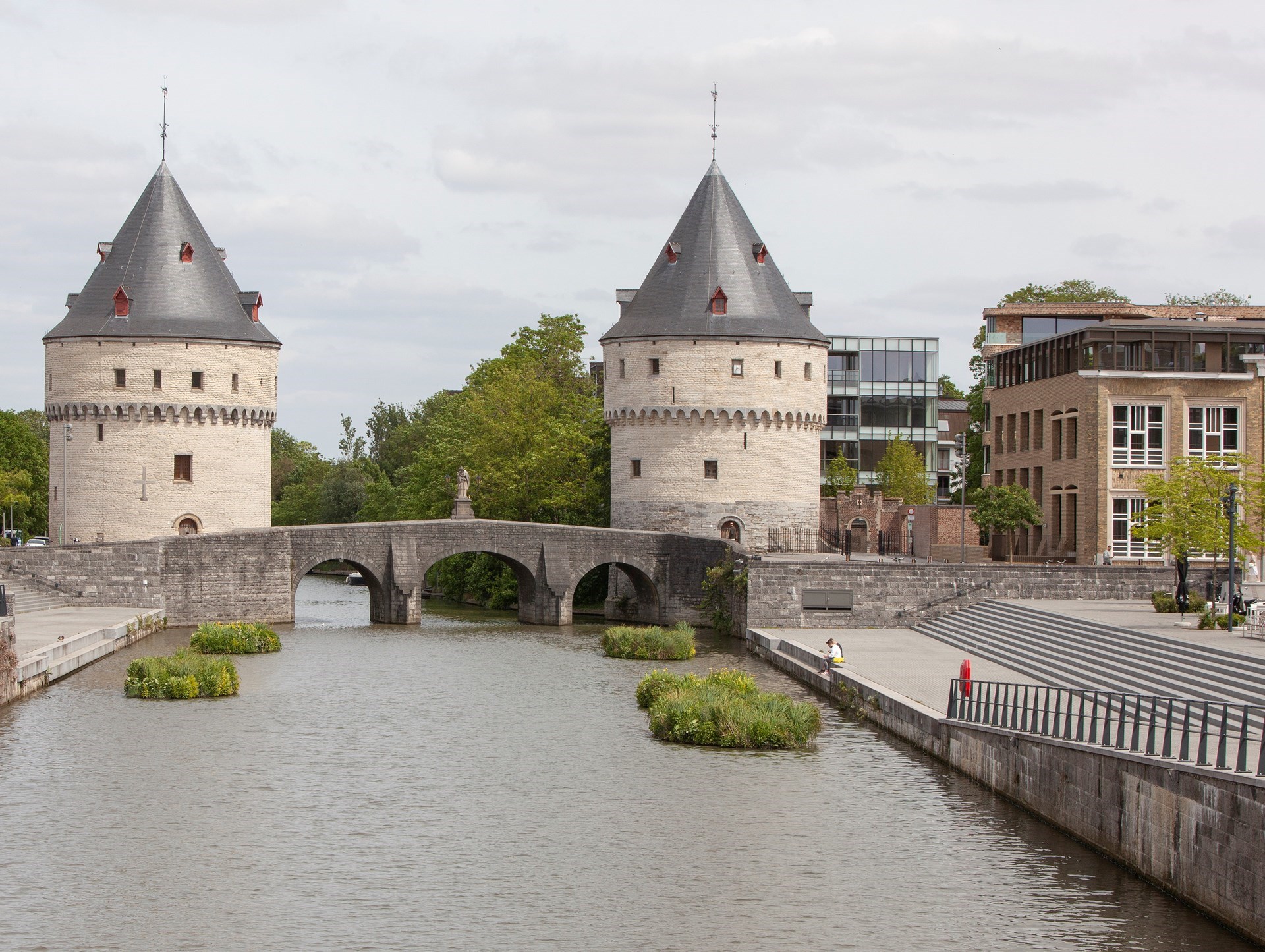 Het ontwerp van Lens°ass architecten bestaat uit vier verschillende gebouwen, elk met hun eigen identiteit. Aan de verlaagde Leieboorden, vlak aan de Broeltorens, bevindt zich de historische voorgevel van de het voormalige schoolgebouw Paulinen: het gezicht en de toegangspoort van One Broel. Langs de kant van de Leie koos Lens°ass architecten voor een glazen wand en wordt het gebouw getransformeerd in een fonkelende reflectie van het aangrenzende water. De raampartijen verdwijnen ook in de grond, alsof een waterval over de gevel valt en de groene bodem het water absorbeert. Dat gebouw kreeg de toepasselijke naam ‘Waterspiegel’.